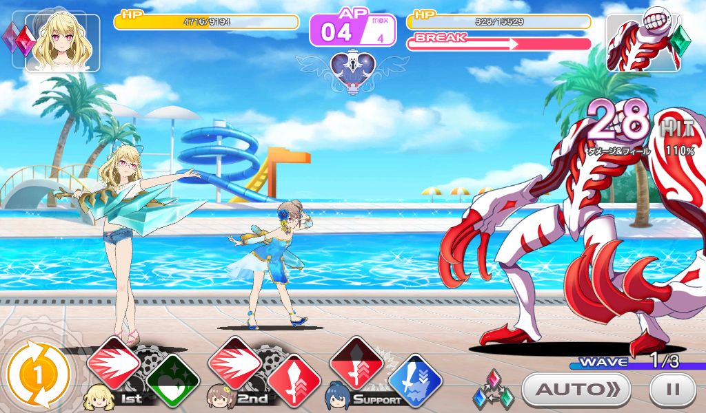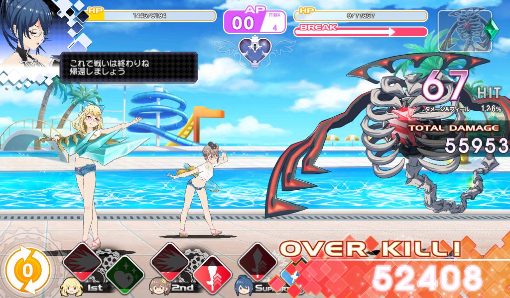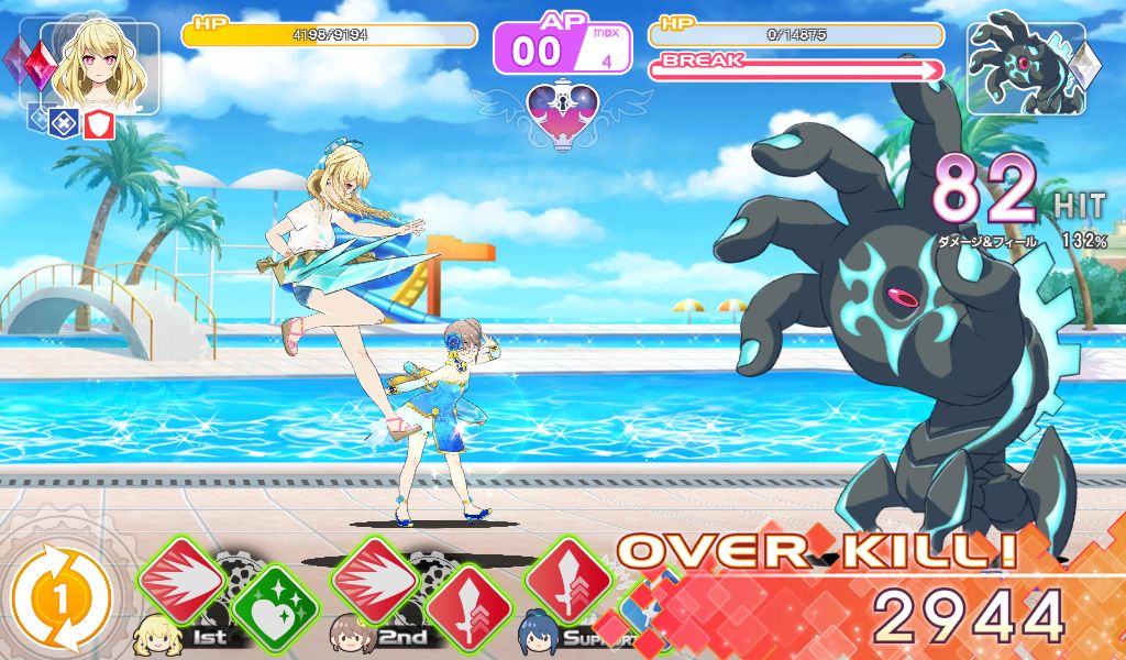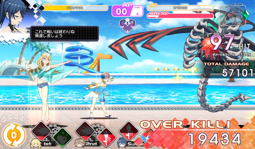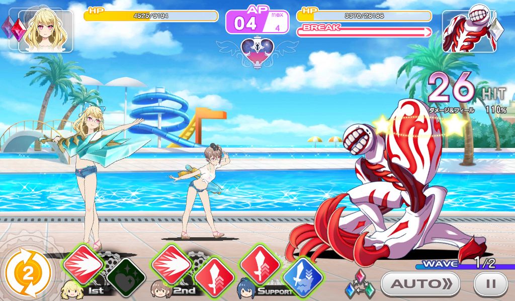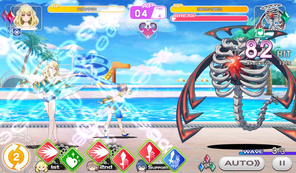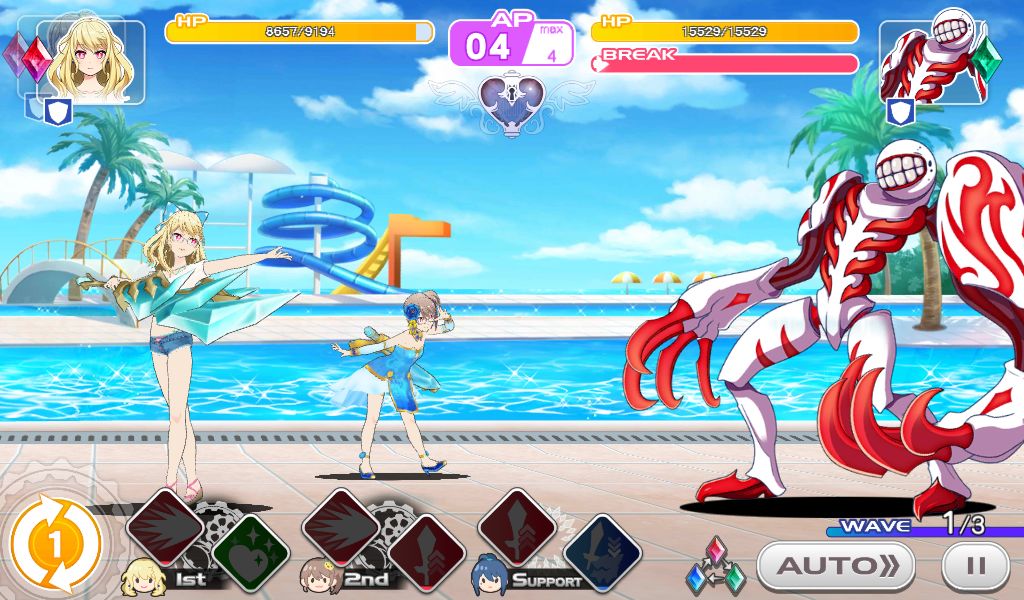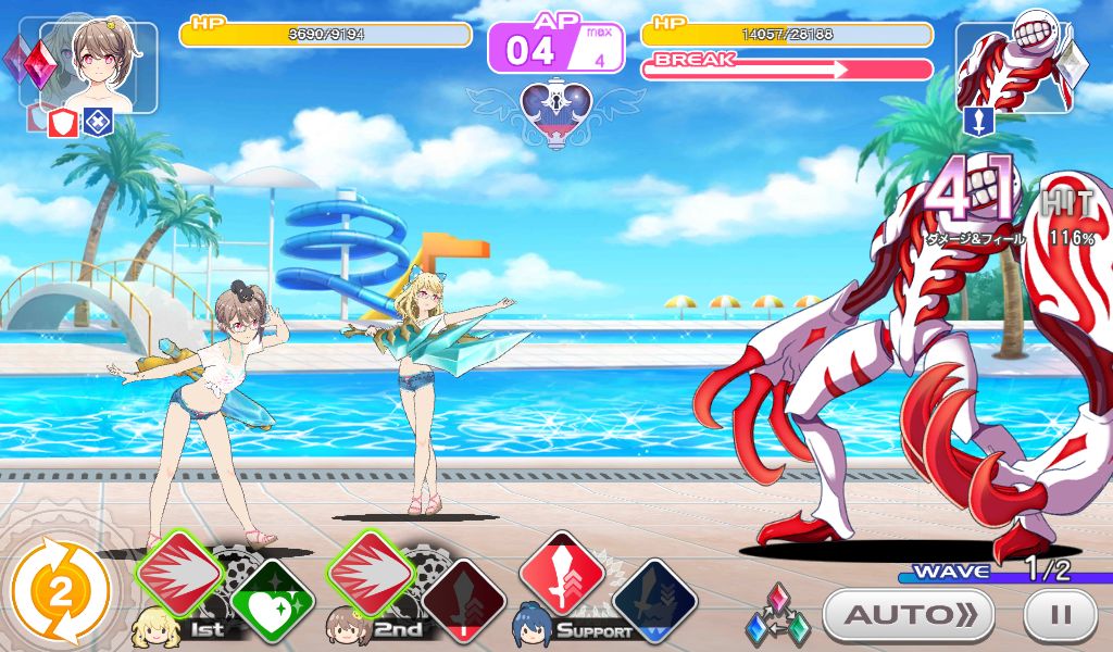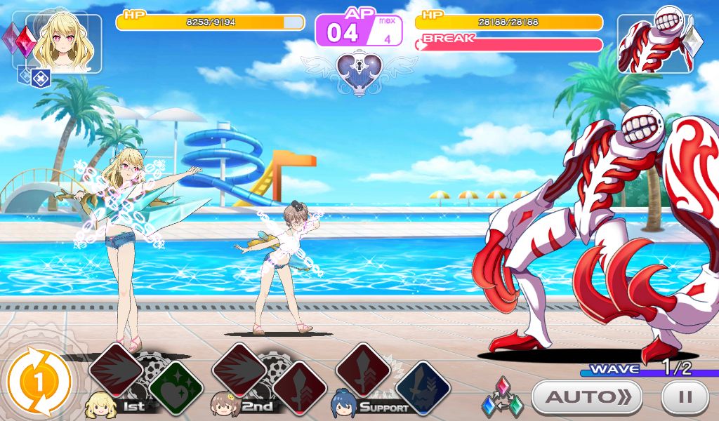 用了第二个泳装SSR的第二个技能台风少女(增加30%攻击和30%防御)然后用辅助位的减少30%攻击力的技能。之后只要我防御BEST它都是打我600多伤害。它有一个技能是四次连续攻击。前三次攻击,你防御的时候快速点击屏幕就行。第四下攻击它会有大后摇动作。(害得我提前防御,导致连击数断了)