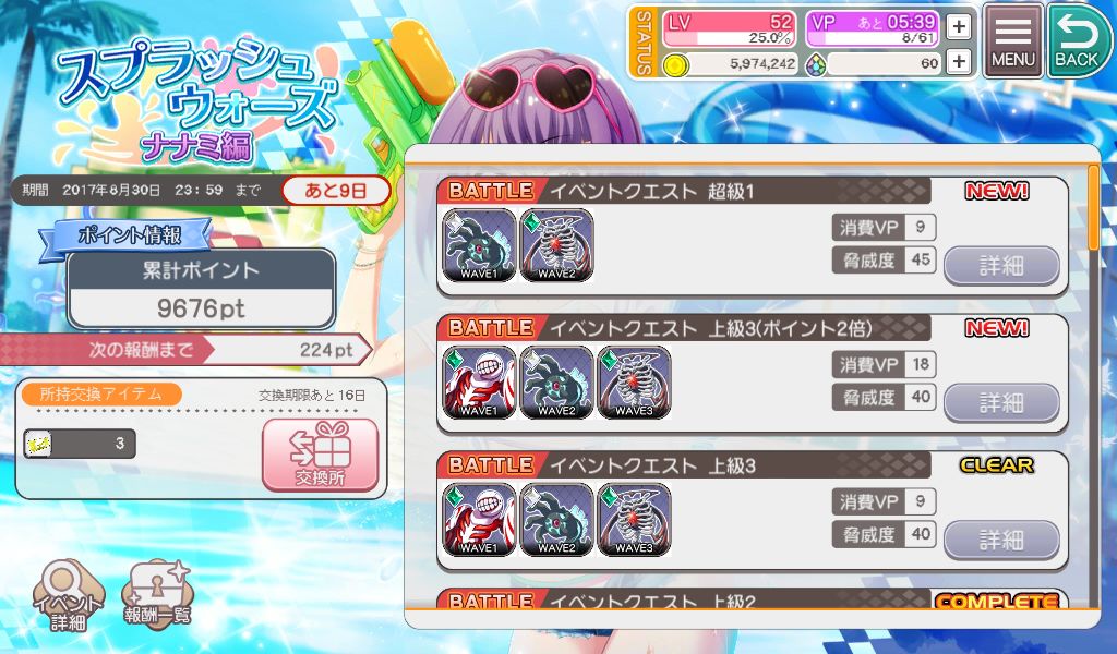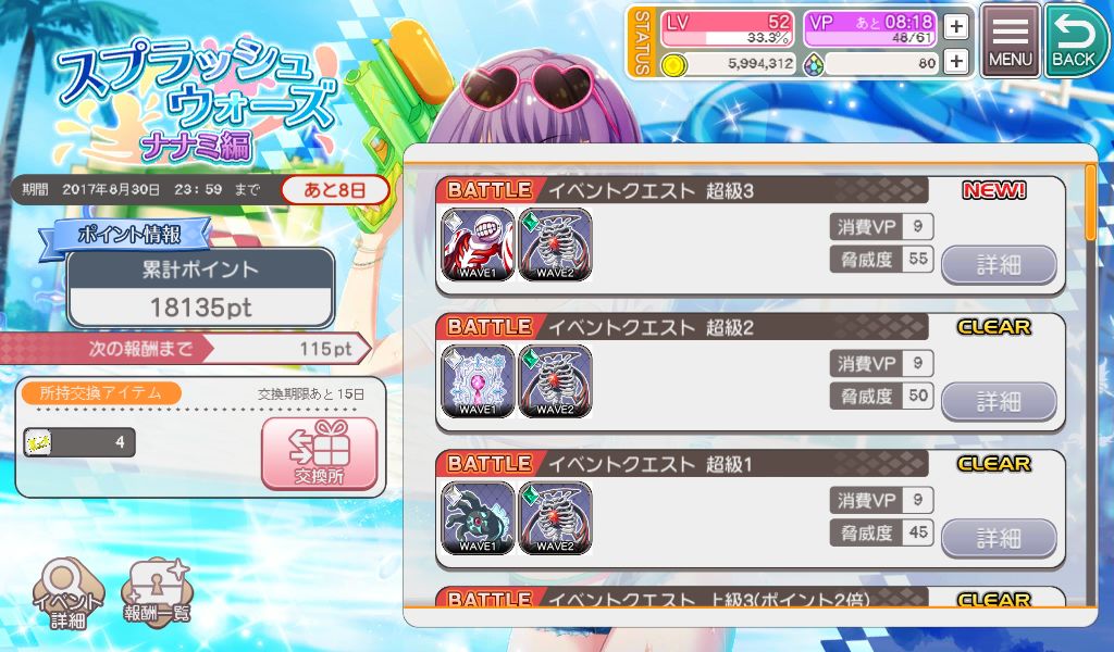红色的剑的那个技能效果是增加自身攻击力130%还有给自身和敌人上了个封印恢复的DEBUFF。(以后可能会出现这种回复生命像是穿了复活甲一样的怪) 超级难度之前,用UR过图有种碾压的感觉,打到超级难度才发现碾不过去,还需要换个“合适的轮胎”才能过去。 说真的,能打到超级难度三的,应该是有输出的,而打到了但又打不过,翻车,还是带个可以封印敌人回复的卡吧。(目前我只知道新卡池的SSR卡有封印敌人恢复的技能)打不过超三也没事啦=—= 上级难度三两倍分数的关(区别与普通的上级难度三相比就是体力消耗两倍)打一百多次!!!也有38万分!!!也能拿到眼镜妹的满破泳装SSR!!! 超级难度三两倍分数的关不过就是一次有5000分以上罢了,打个几十次就有38万分罢了,打完一次以后可能从金色箱子拿到五星狗粮罢了......要努力啊! 我没有想说的了,也不会去在修改内容了。 最后,要努力啊!各位!活动结束就要开学辣!(今年上高中,内宿生)