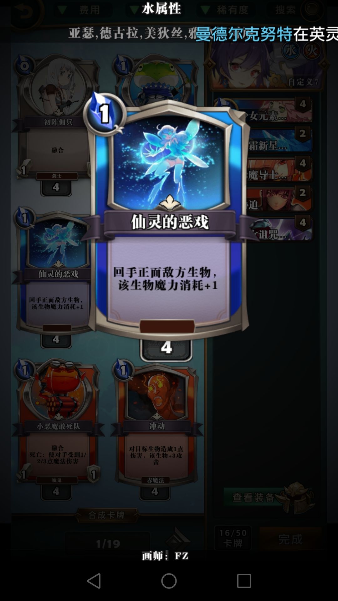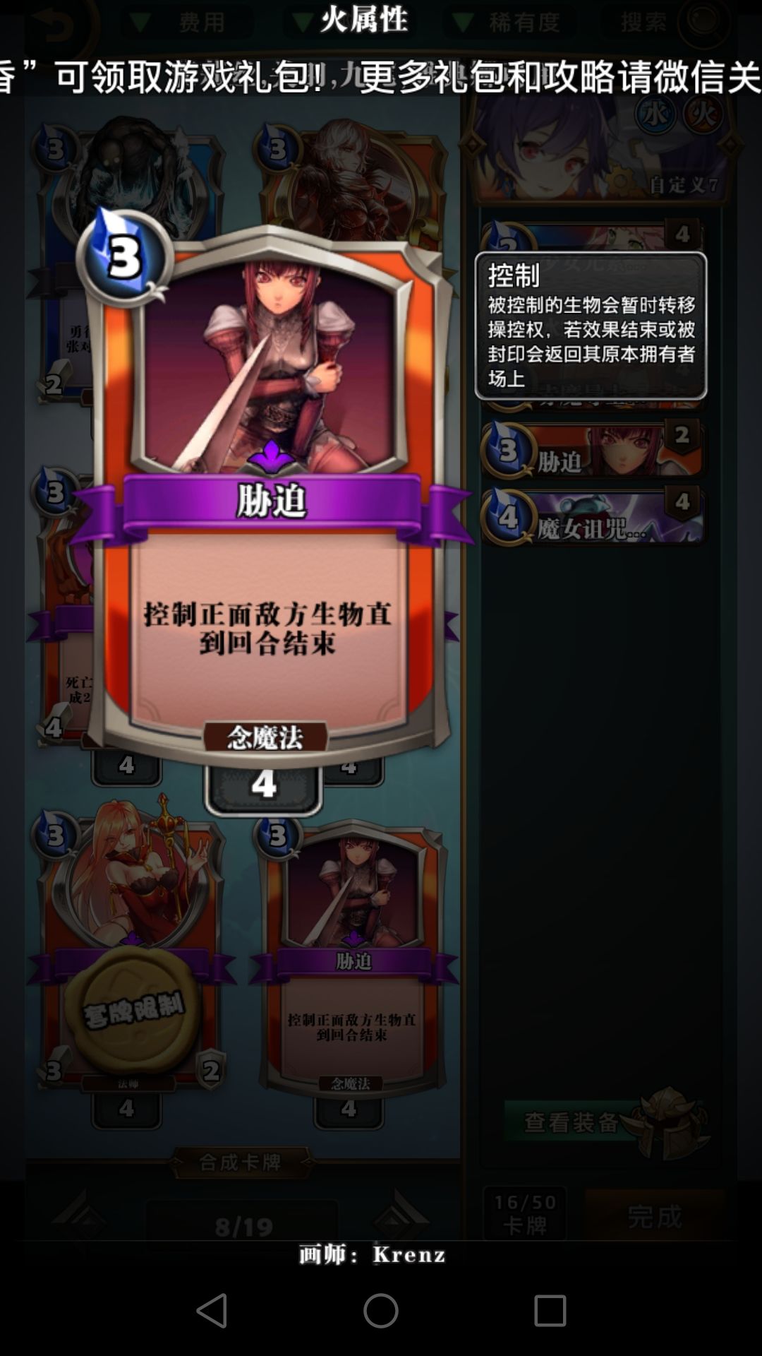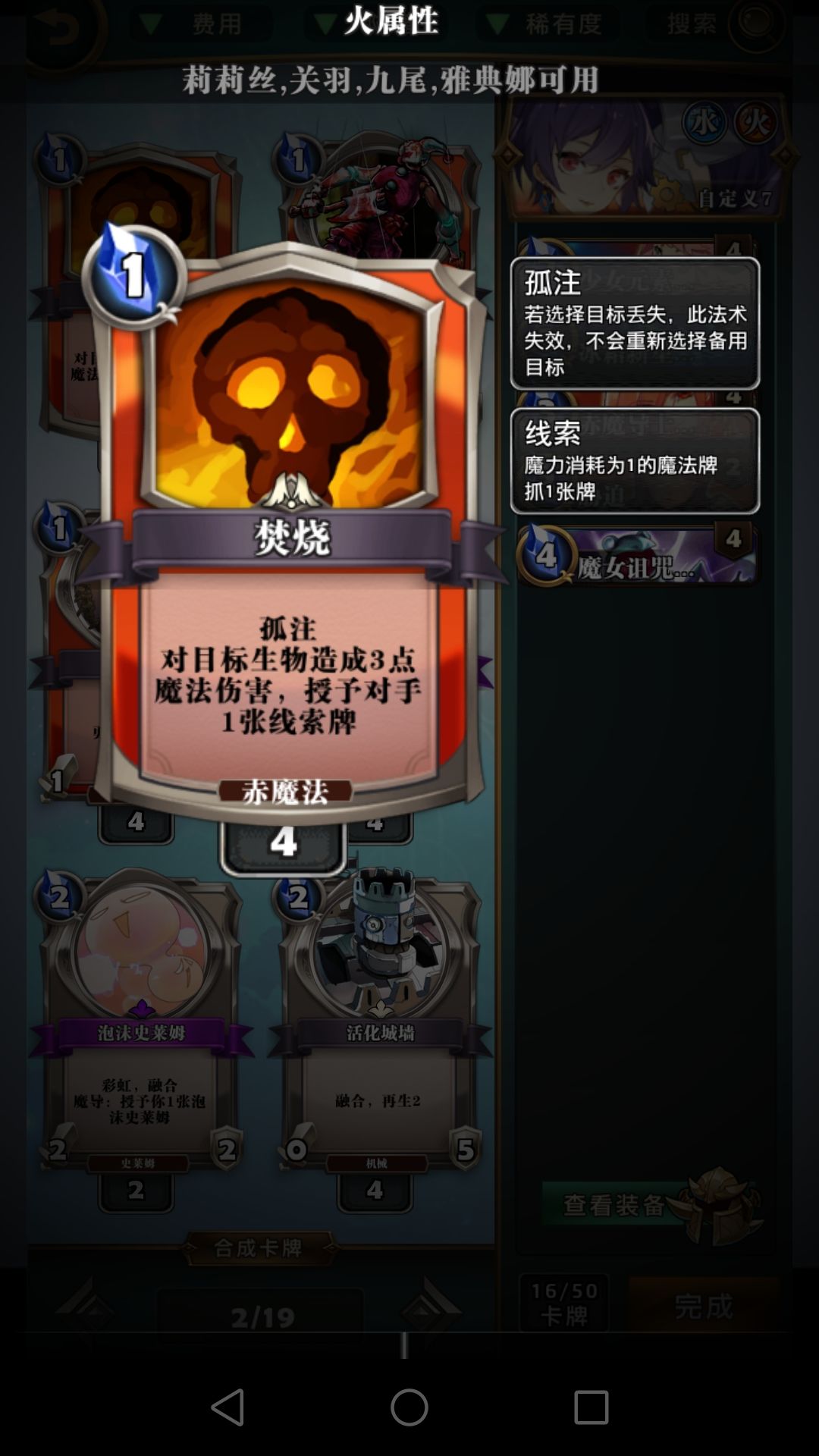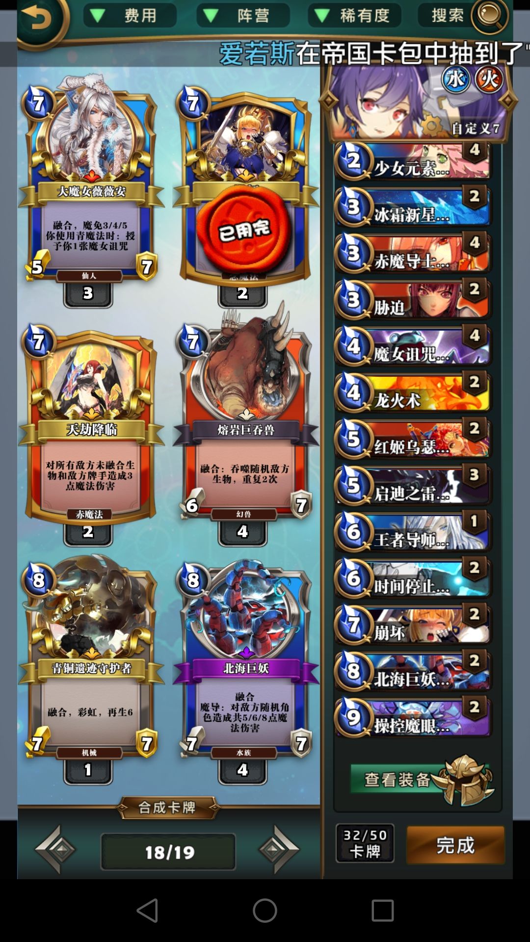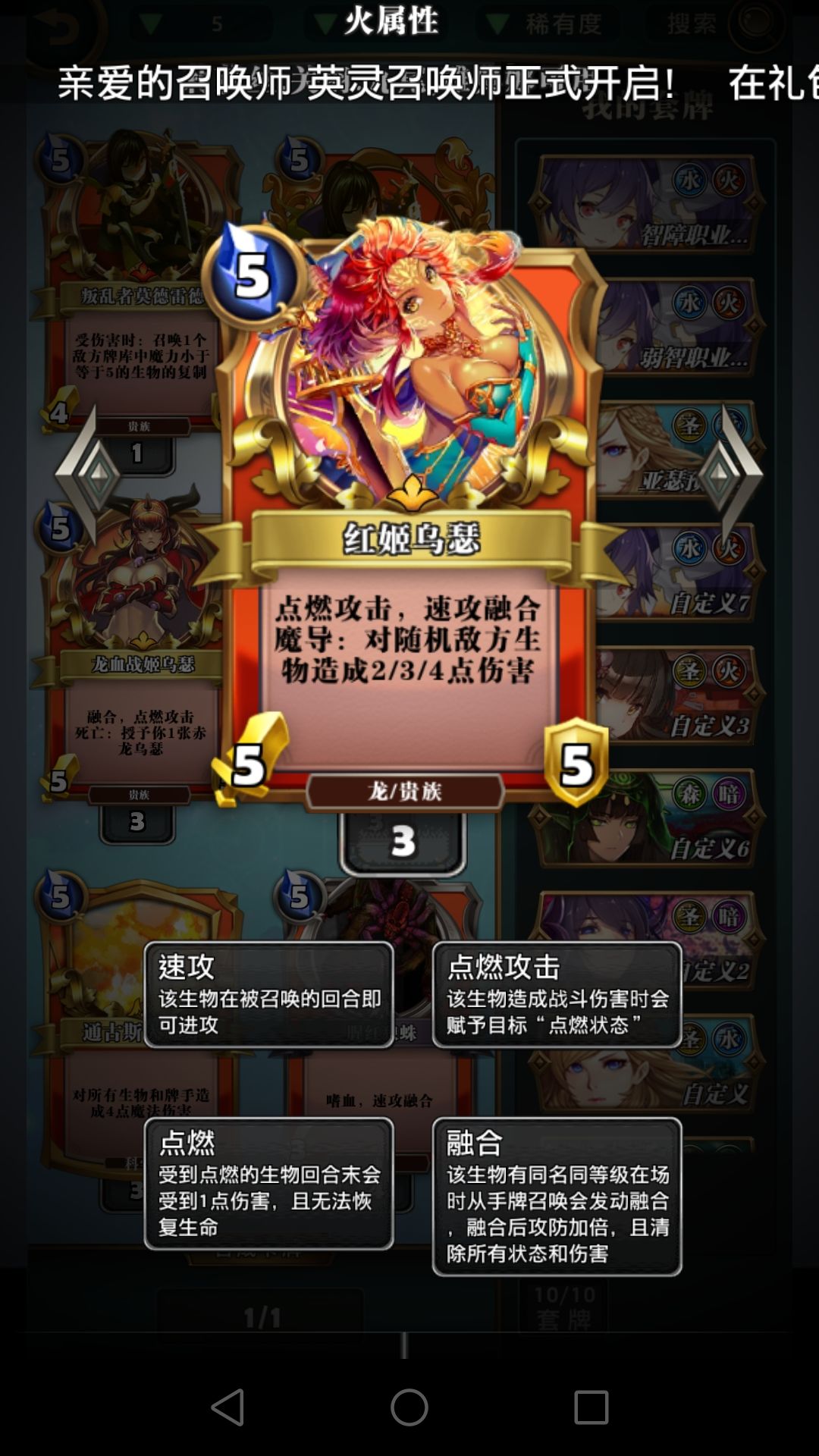 冰环,呱,胁迫这些费用较低的控场牌比龙火重要得多,龙火完全可以换别的,比如仙灵的恶戏。焚烧这版本比较鸡肋,大屁股怪解不掉,速攻怪解了没太大意义,低费的怪容易融合,元素使现在也不再需要极低费的法术启动,不建议带。打红黑6费以后记得留个胁迫处理魔王威仪。