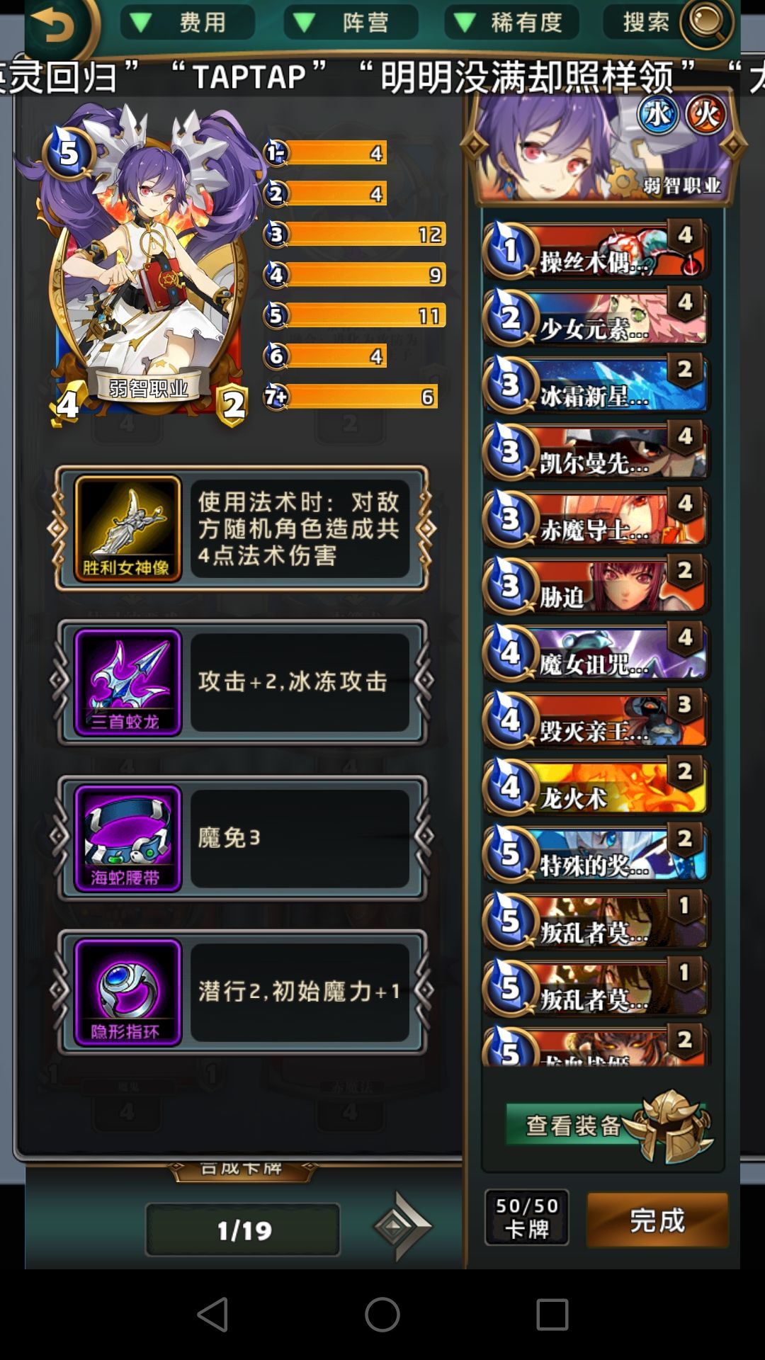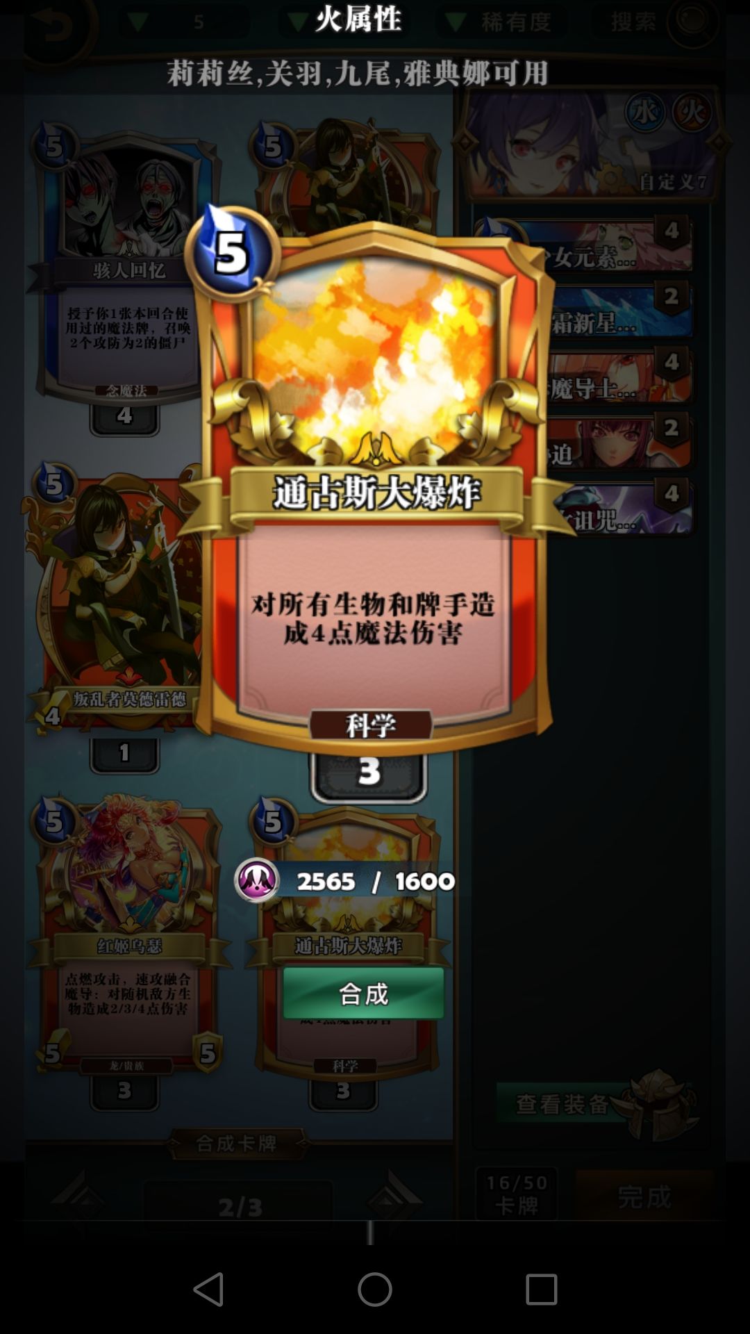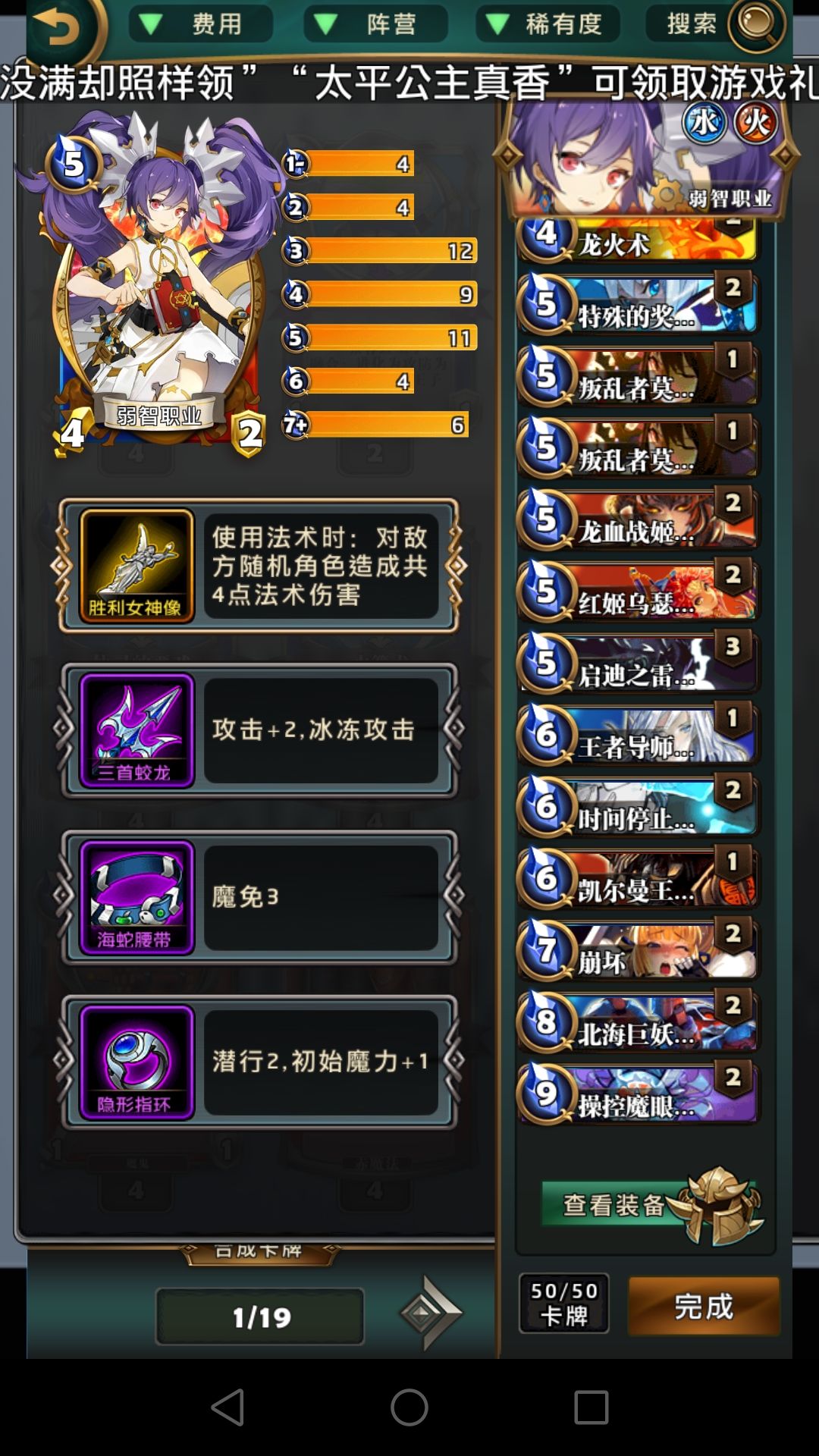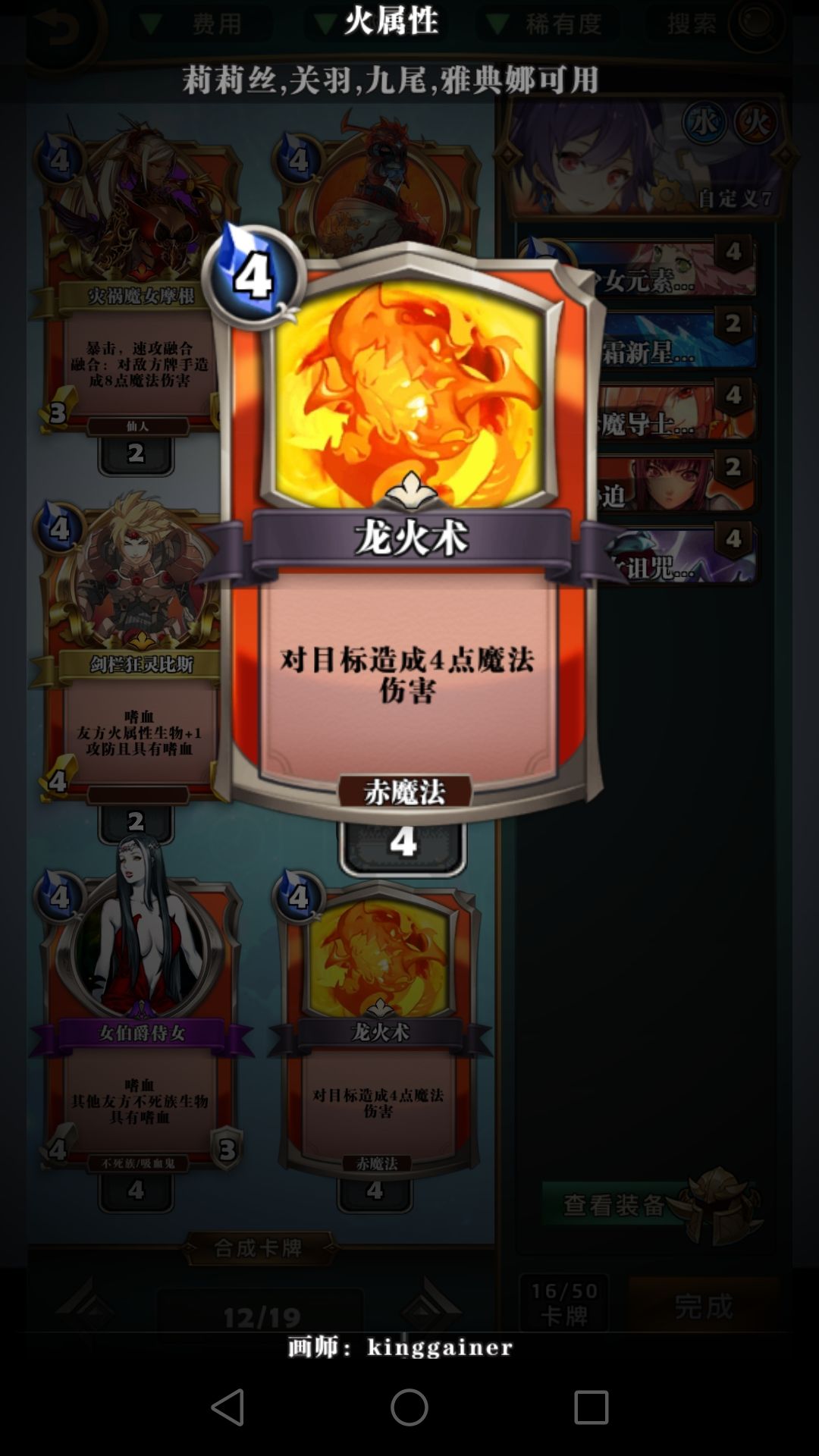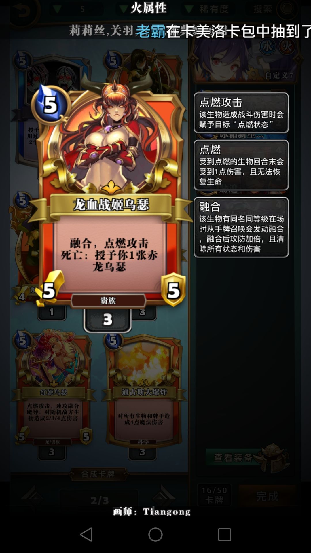 冰环,呱,胁迫这些费用较低的控场牌比龙火重要得多,龙火完全可以换别的,比如仙灵的恶戏。焚烧这版本比较鸡肋,大屁股怪解不掉,速攻怪解了没太大意义,低费的怪容易融合,元素使现在也不再需要极低费的法术启动,不建议带。打红黑6费以后记得留个胁迫处理魔王威仪。