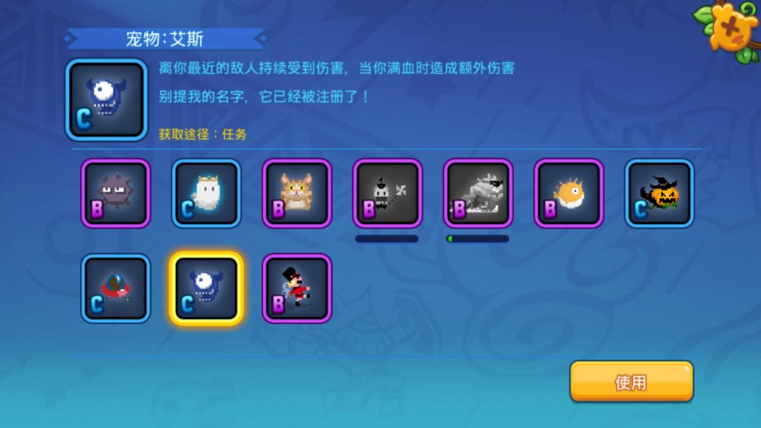 技能:离你最近(五格距离内最近)敌人持续受到伤害(大概半格血伤害满级随宠栏)当你满血时造成额外伤害(一格)