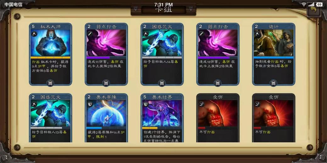 打法思路:第一个回合手上必须有秘书大师或者奥数结界这两张卡的其中一张来吃掉BOSS的第一波伤害,因为易伤流是要时间积累易伤层数,然后一波爆发将其秒杀的,不可能一个回合就解决,但给了我们两到三回合的时间,BOSS的血条再厚也是可以打掉的。
