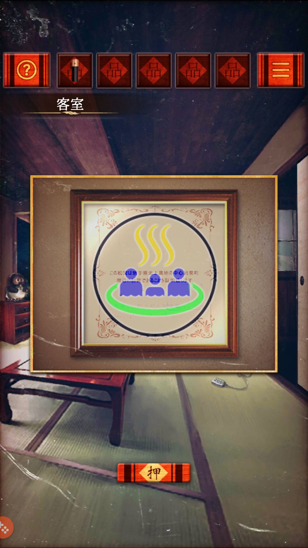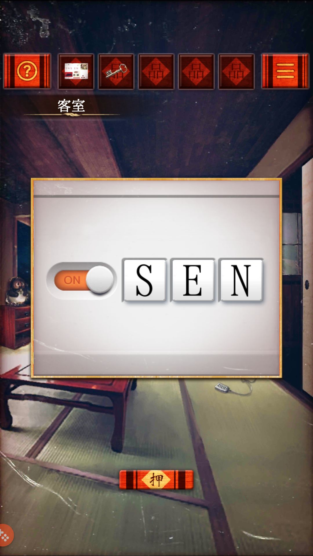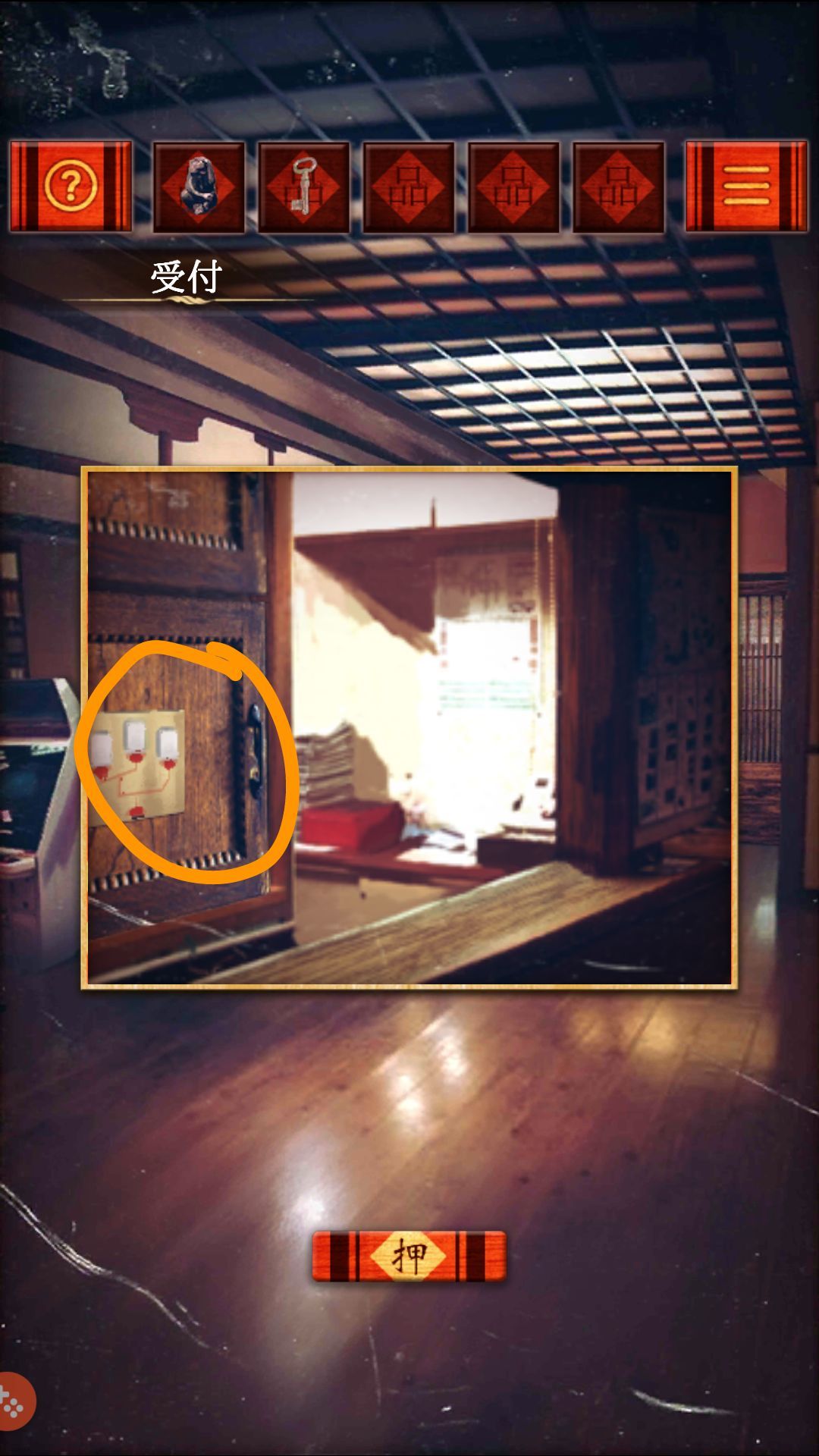 第一关(客室)收集 红柜第二格的小木叉,用叉子叉开红桌上的和菓子的馅,分别是 粽 绿 红,根据颜色打开保险柜,拿出零钱包里的硬币。