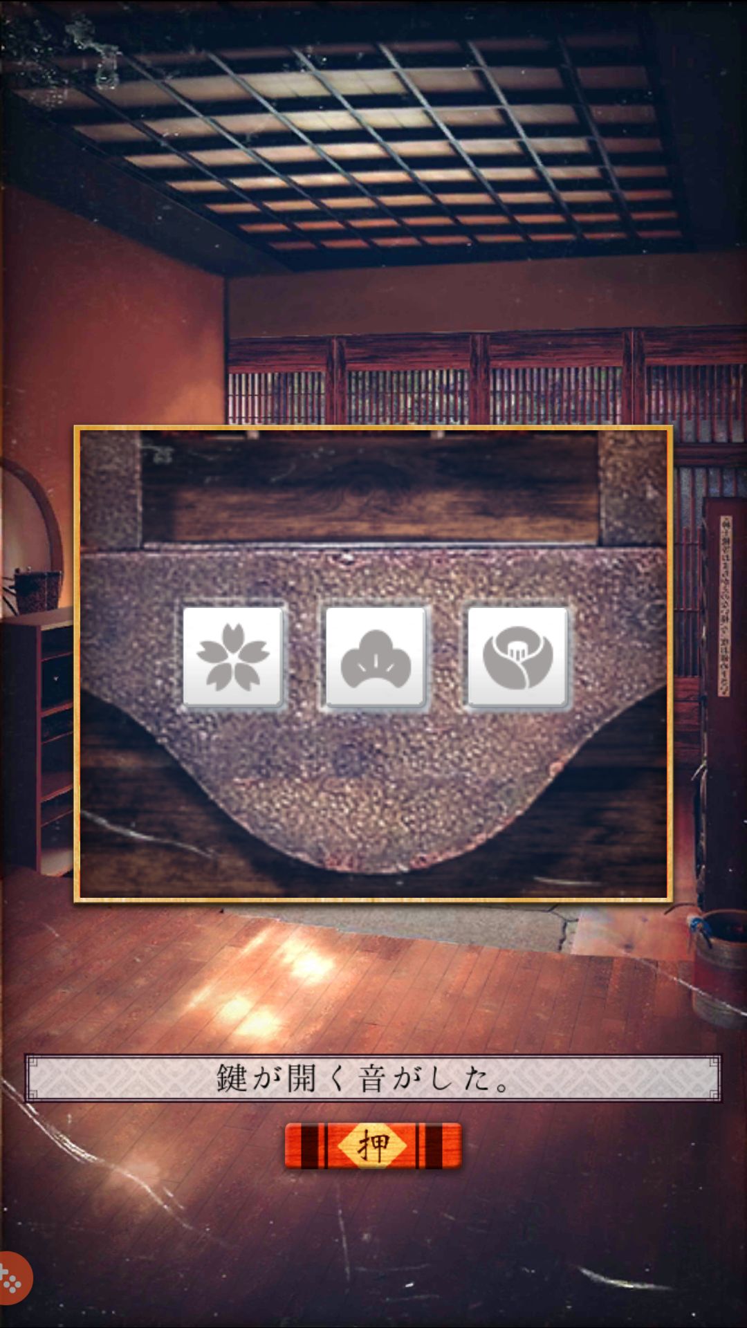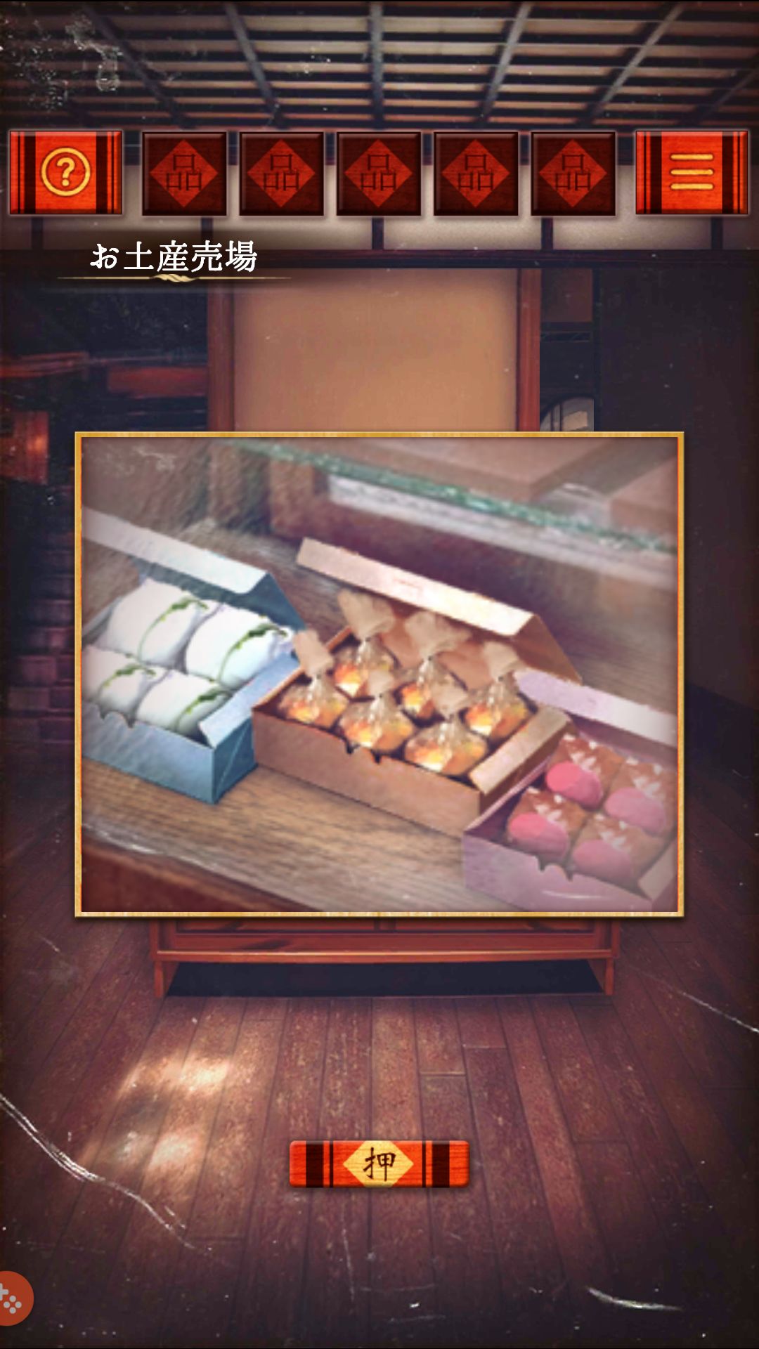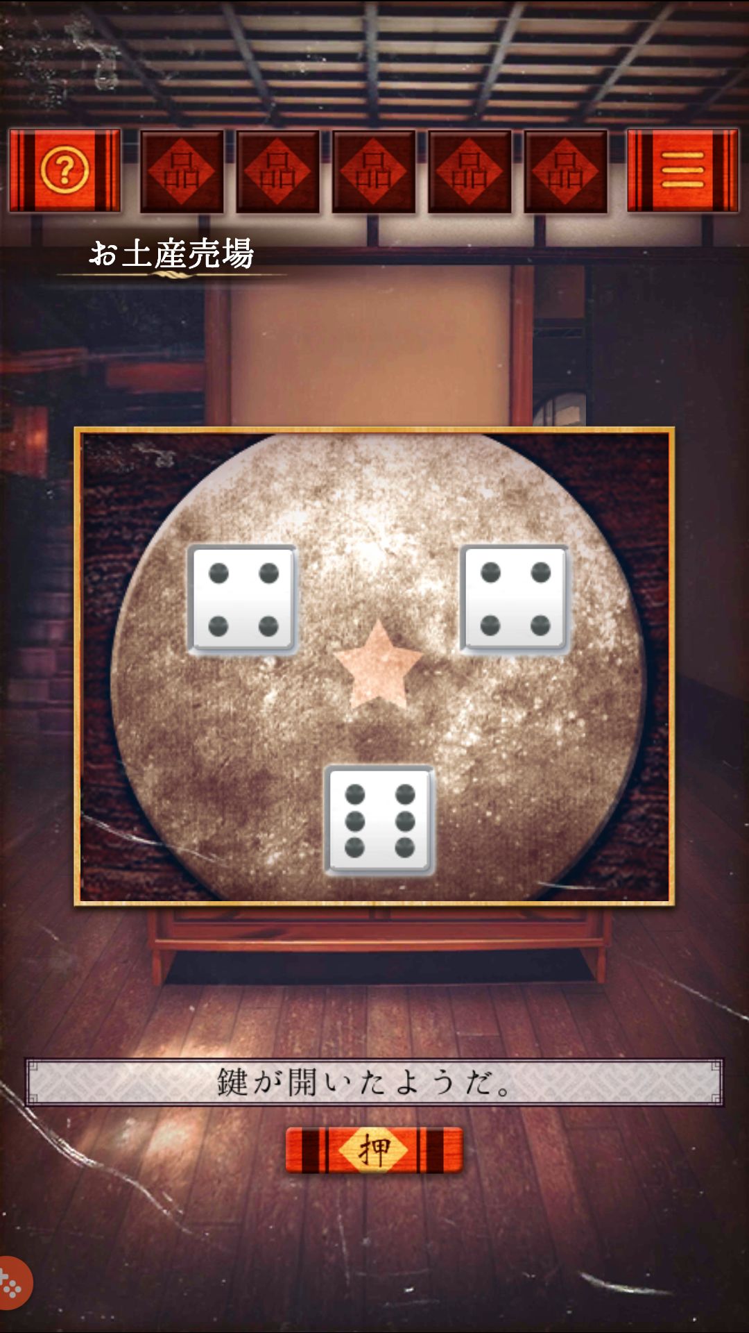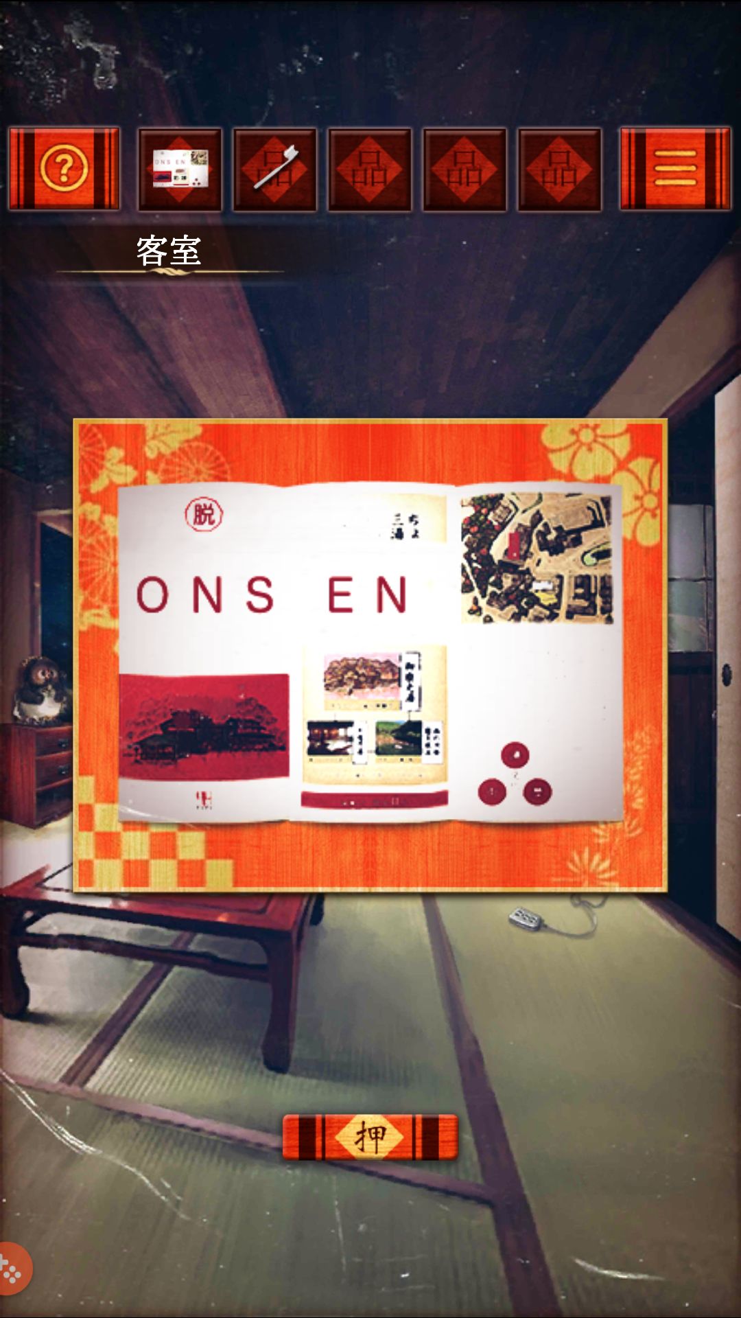 第一关(客室)收集 红柜第二格的小木叉,用叉子叉开红桌上的和菓子的馅,分别是 粽 绿 红,根据颜色打开保险柜,拿出零钱包里的硬币。