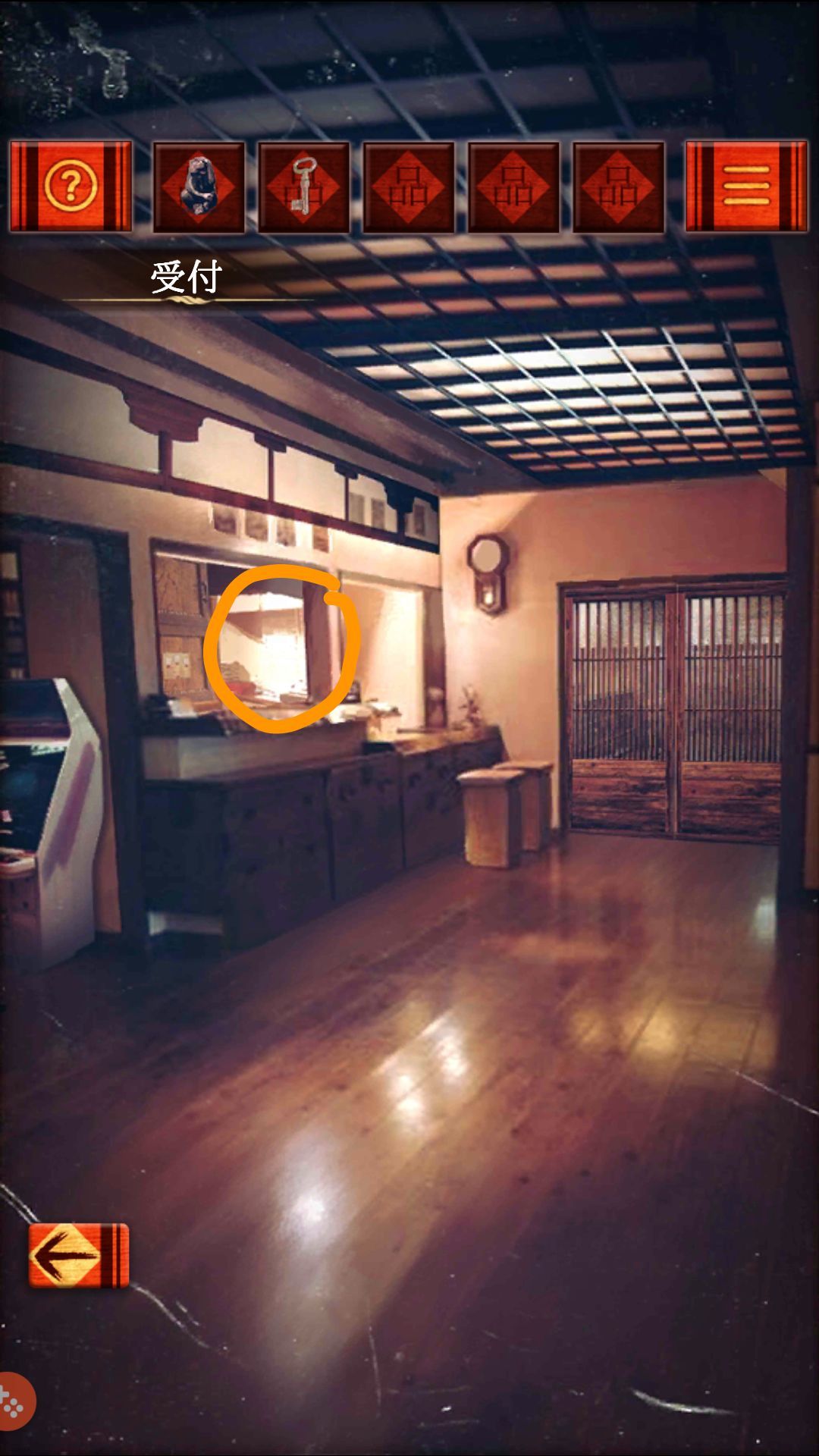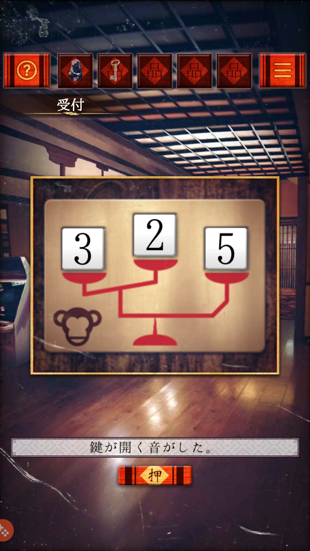 (受付)两枚电池放入墙上的钟,获得金钥匙,用金钥匙打开右侧木门,过关。