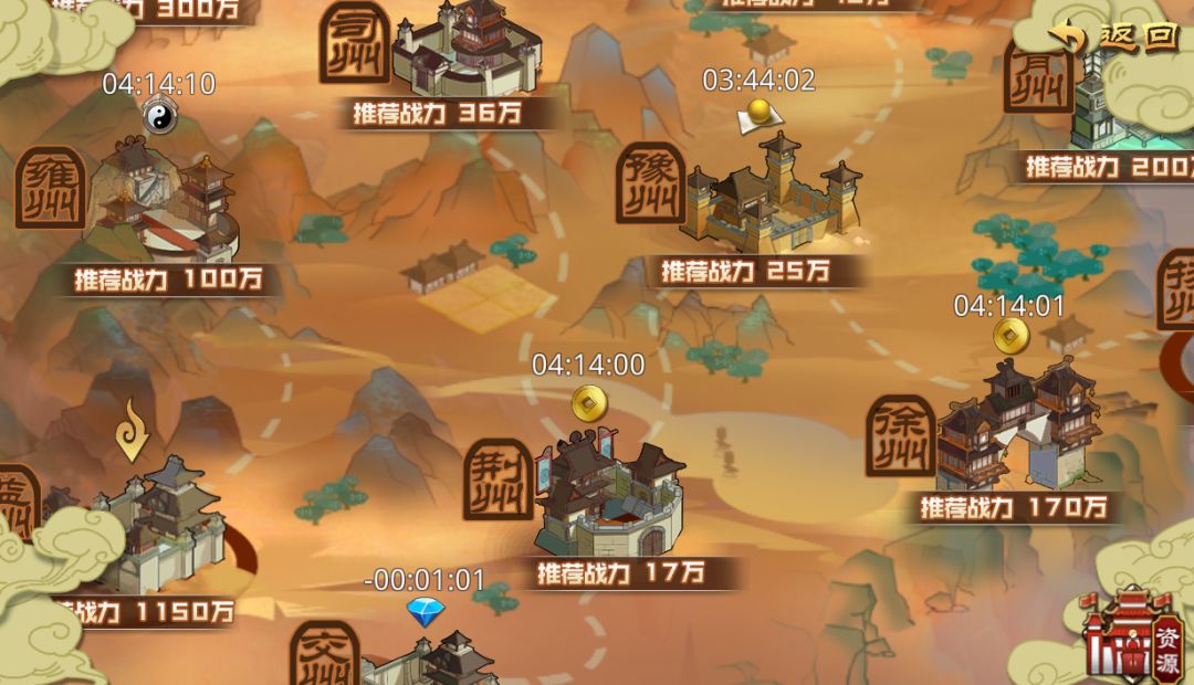 看图可以看出闯荡九州是一个攻打城池的玩法每攻打下一个城池,每天都可以收获常用的资源,例如钻石、金币、宝石。闯荡九州里的关卡也会掉落宝石箱以及橙色套装碎片,这个关卡也是玩家们变强的一个途径,只要你的战力足够。