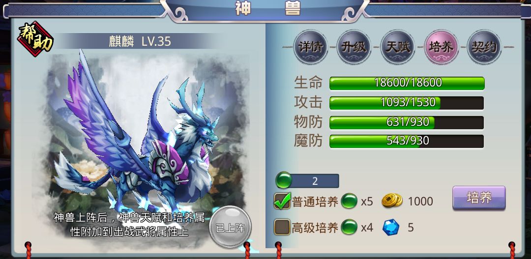而神兽的培养是很关键的一个地方,这里的生命、攻击、物防、魔防都会加持在所有上阵武将的身上,神兽培养的资源是可以在日常的活动当中产出的。每个玩家可以上阵一只神兽,以及契约3只神兽在3个武将身上,契约的神兽也会将天赋、培养的属性加持在契约的武将身上,但是只能契约4星的武将。