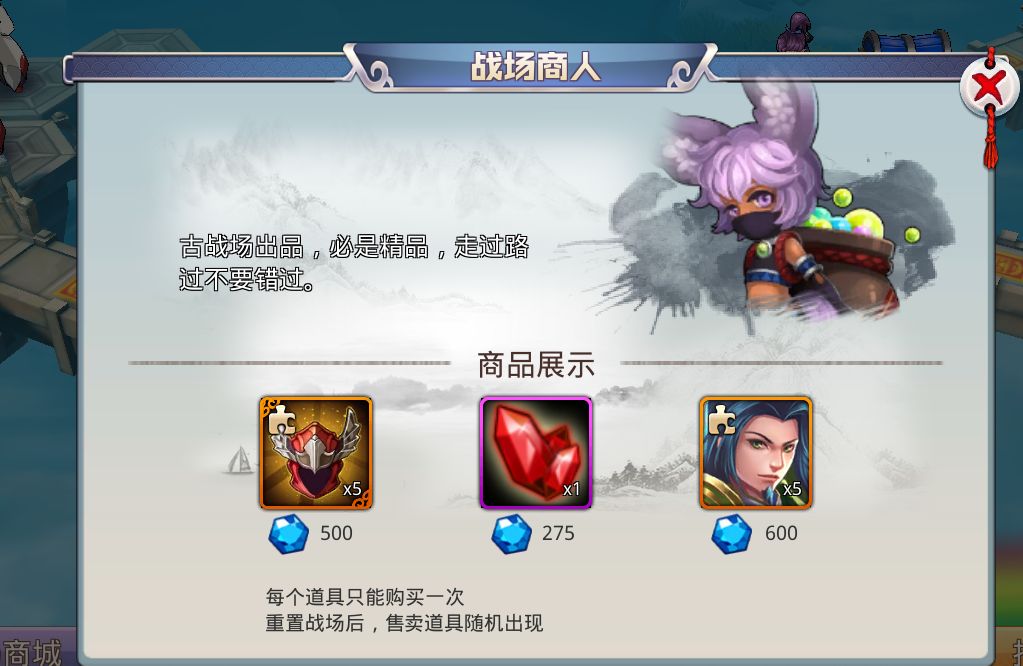 古战场里有战场商人,战场商人会出产一些好东西,例如四级宝石,橙装碎片,武将碎片。这个关卡大家日常都打一打,也是小福利。