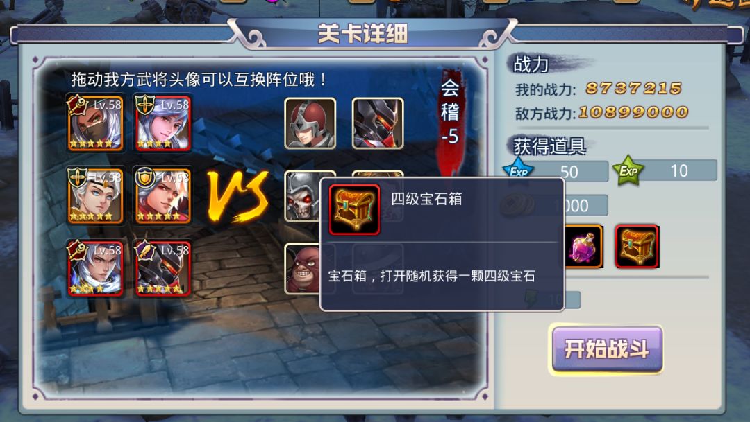5次扫荡就有50的经验,前期经验很可观,建议每个BOSS关卡扫荡5次就好,当然要是觉得自己钻石够多的话,那就一直扫荡吧。在日常任务都做完的情况下这是前期拉开战力一个很重要的点,武将升级之后的技能以及装备的锻造会给战力带来质的提升,萌新们可以学习一下阵容搭配,(剧透下下期就好好跟你们说下如何组建最强阵容!)在确定自己阵容之后再用英雄兑换令去兑换自己想要的任何武将,前期的武将兑换令千万不要浪费掉。