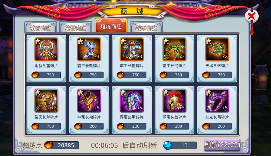 也有萌新会疑惑,套装怎么获得?看到这个熔炼商店了吗,熔炼掉一些不要的装备会获得熔炼点,就可以在熔炼商店里面兑换想要的装备碎片了,橙装要60个碎片才可以合成。熔炼不同的装备也会得到不同的熔炼点,熔炼橙色装备获得的熔炼点很多哟。但是友情提醒—点这个刷新是要钻石的,而且越点需要的钻石就越多,萌新们请慎重。