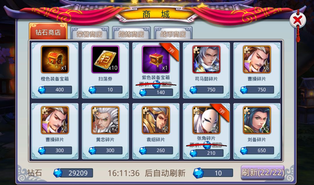 武将的升星是需要碎片的,那么碎片除了推图会获得以外,还有一个途径。钻石商店——出产各种武将的碎片,但是,希望大家在确定阵容之后再选择这些碎片的兑换以免造成钻石的浪费。温馨提示——这个刷新也是越点需要的钻石越多哟。