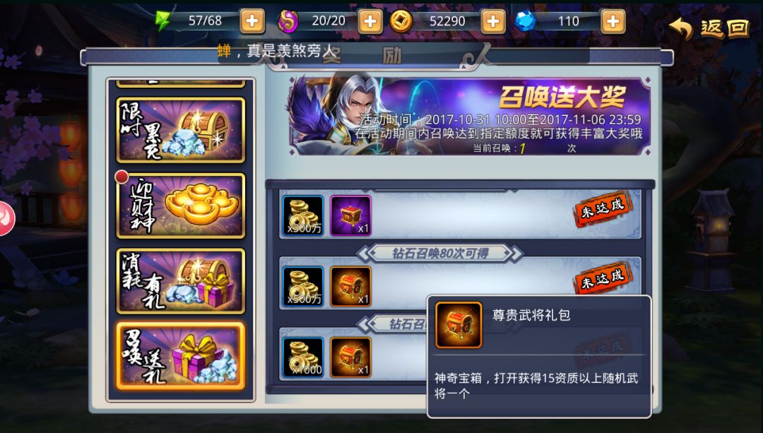 对于自身条件比较优渥的同学们,个人建议你们可以抽满120次召唤,在前期金钱稀缺的情况下可以获得大量的金币。在这120次的抽将当中,将会获得三个武将礼包,紫色那个箱子以及最后一个箱子在运气够好的情况下可以开出红色武将,中间那个橙将礼包可以开出15资质以上的橙色武将。