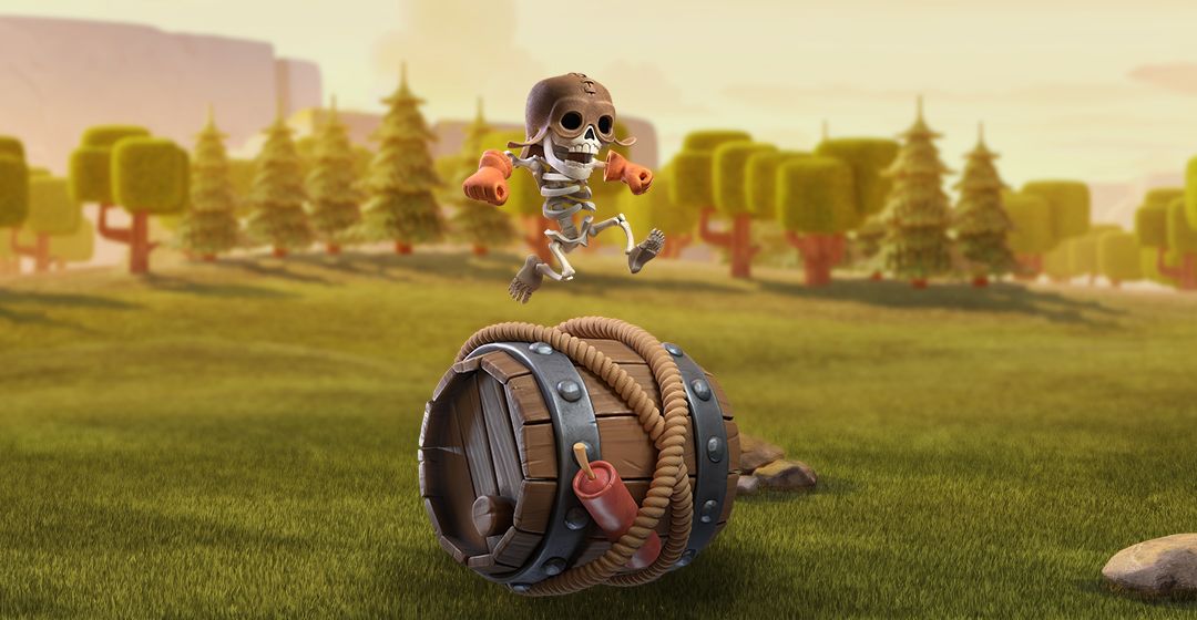 另一个城墙克星——炸弹人,也出现在了首批可以强化的兵种名单中。这些对城墙有执念的骷髅战士,以往都是抱着炸弹往前冲、如果没有强力掩护,在对方村庄强大的火力面前,往往还没走到墙根下就被打飞,手中的炸弹也变成了哑弹。而得到强化的超级炸弹人,直接踩着炸药桶冲锋,不管能否抵达目标,使用延时引信的炸药桶都一定会爆炸,并且对区域内的建筑物造成溅射伤害。这样的设计不但极大提升了破墙的成功率,在某些特定的玩法中,玩家甚至能把它们当主力部队使用。