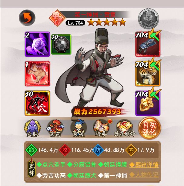 人物培养攻略:作为无可争议的第一拳师,即便我是一拳超人我也有可能打的你这回合不许动,我就是这么优秀。不过依然还是适合土豪玩家只有在土豪的手里雷震才能发挥最大的效果。没有穴位谱,龙爪手的玩家还是不要考虑他了。伤不起的。