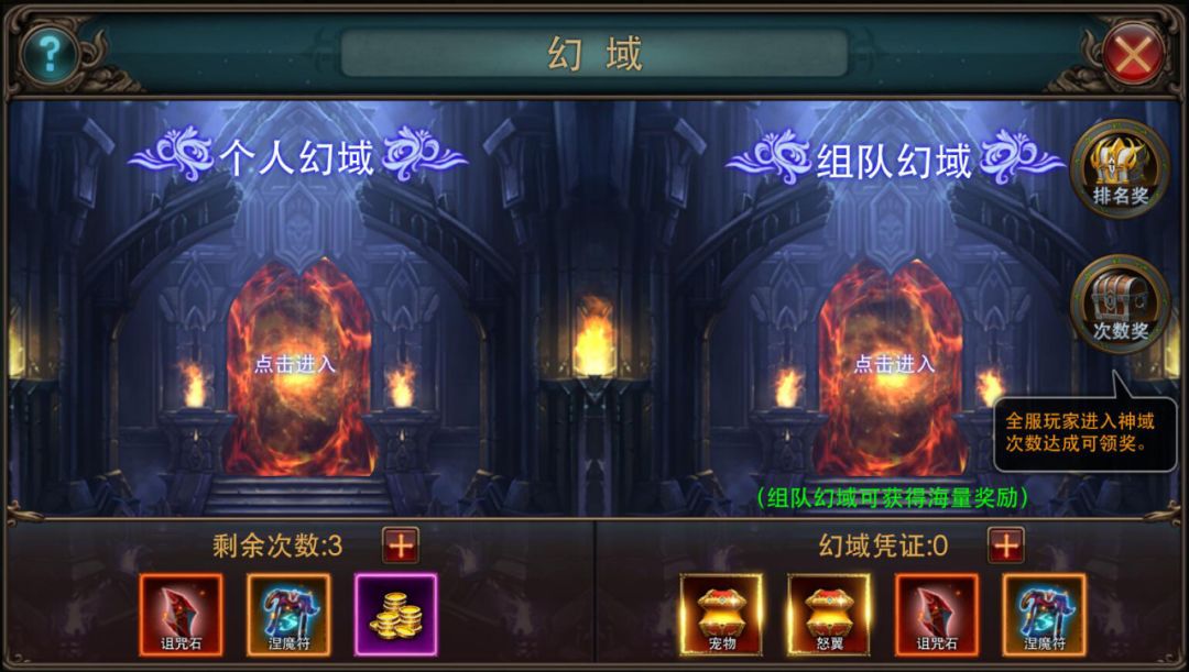 魔域和神域都分别有三种特殊的战斗模式,分别为奇兽域、金迷域、深渊域,这三种不同模式为随机选择。