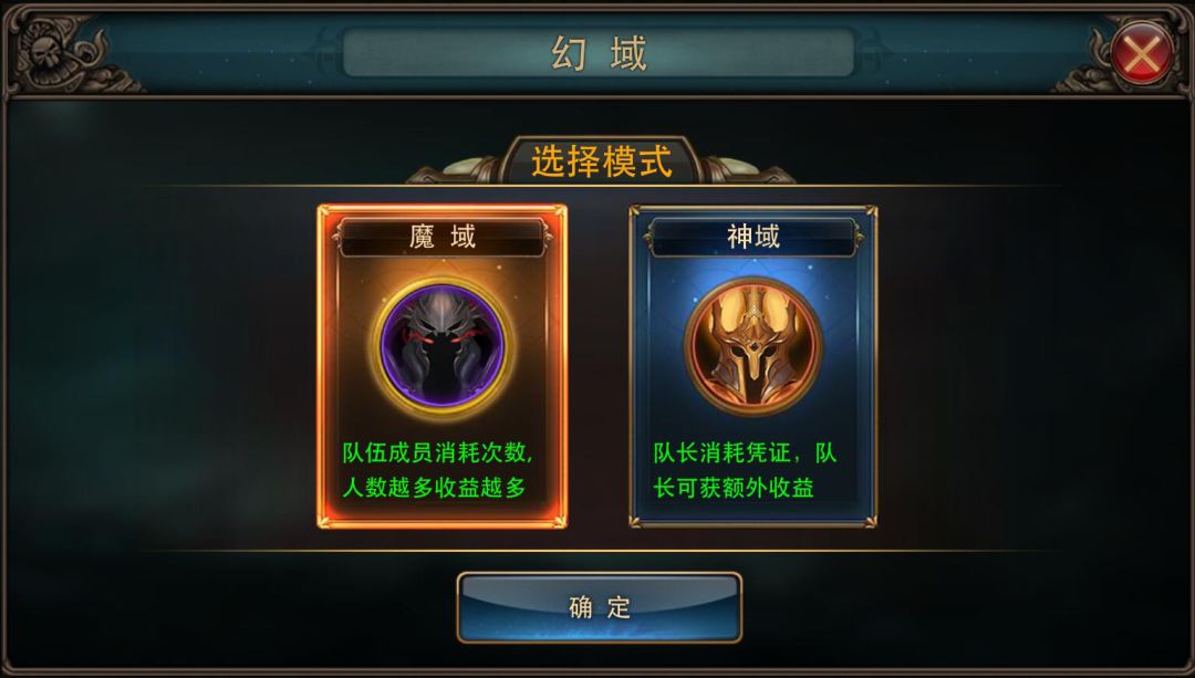 相比于个人幻域的实力展现,组队幻域就更依靠团队的合作和默契了,但组队幻域又分为神域和魔域两种,如要进入魔域则所有队员共同奋战,并且都消耗一张幻域凭证,而神域更为看重队长潜力,考验队长带队本领;只需要队长消耗幻域凭证,理所当然队长奖励也自然会更为丰厚。