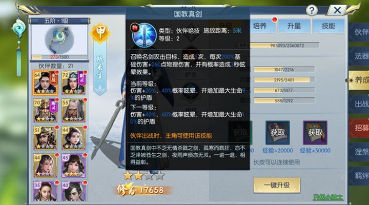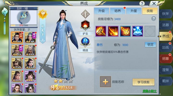 在技能等级上,如果物理输出型职业如离山剑宗和天机阁,在没有圣级伙伴的前提下,可以将长生作为主要培养伙伴。高级技能书可以直接学习。其次就是中级技能书的学习了,低级技能书不建议甲级伙伴陈长生学习,因为作为一个主要培养的伙伴,低级技能的效果对伙伴绝技的提升太低了。当然在前期开启伙伴技能栏的时候,可以使用低级伙伴技能书,先进行技能栏的开启,以后再使用高级或者中级的伙伴技能书进行覆盖。