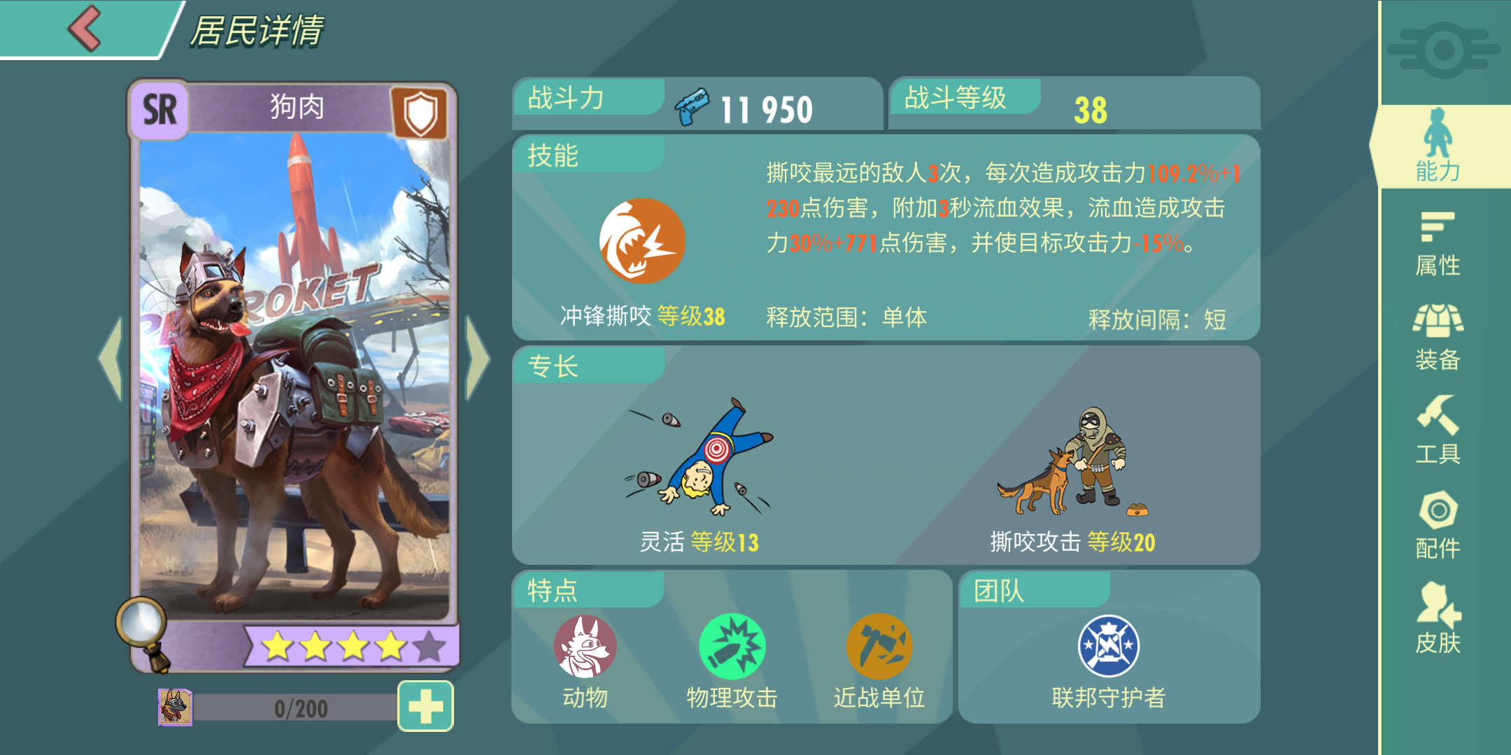 推荐理由:虽然狗肉同凯特一样,是一个闪避型前排,但是狗肉的技能决定了它同样可以当做一个突击型后排刺客来使用!我们都知道废土天团唯一的输出点就是外星人,那我们就要想办法先干掉外星人,而狗肉就是一个突破点!利用狗肉的技能可以有效的压低外星人血线,给丹斯秒杀外星人做铺垫! 配件选择:狂蚁女之怒(利用狂蚁女特效最大化狗肉技能的输出,给丹斯提供有理保障。) 配件属性选择:优先选择攻击.生命,闪避次之。