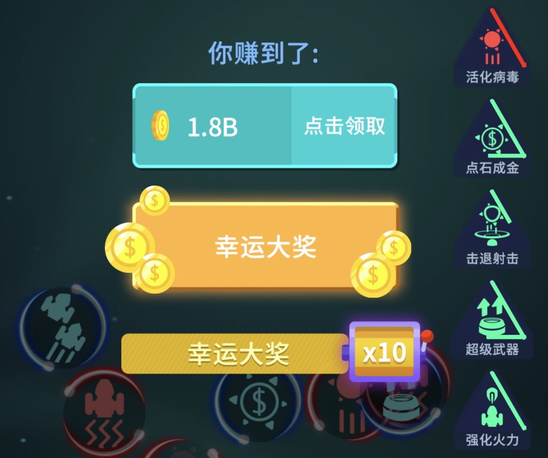 • 一般到二十多关的时候就会感觉到吃力难打了,这很正常,这时候就需要把小火炮强度升满了,游戏目前每天有3次副武器满级试用,满级试用搭配幸运大奖可以加速刷金币(开局打死几个病毒然后就去送死,这样送死4次,下一局就能刷出一个幸运大奖,满级试用搭配幸运大奖来用,幸运大奖最低6倍)