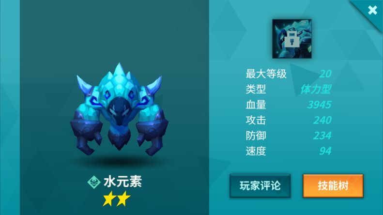 水元素属于守序阵营,初始为2星。1技能加能量;2A技能会根据自身血量给予伤害和暴击概率加成,2B技能为特色技能,可以给队伍中其它元素加血;两个被动的3技能都是特色技能,场上元素越多,威力越大。