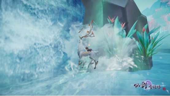 临近瀑布,偶遇一只调皮的喵咪,捏了个仙术,变成天禄想吓唬一下这只调皮的喵咪,却不料被它乘机爬了上来。瀑布之下,嬉戏打闹着。