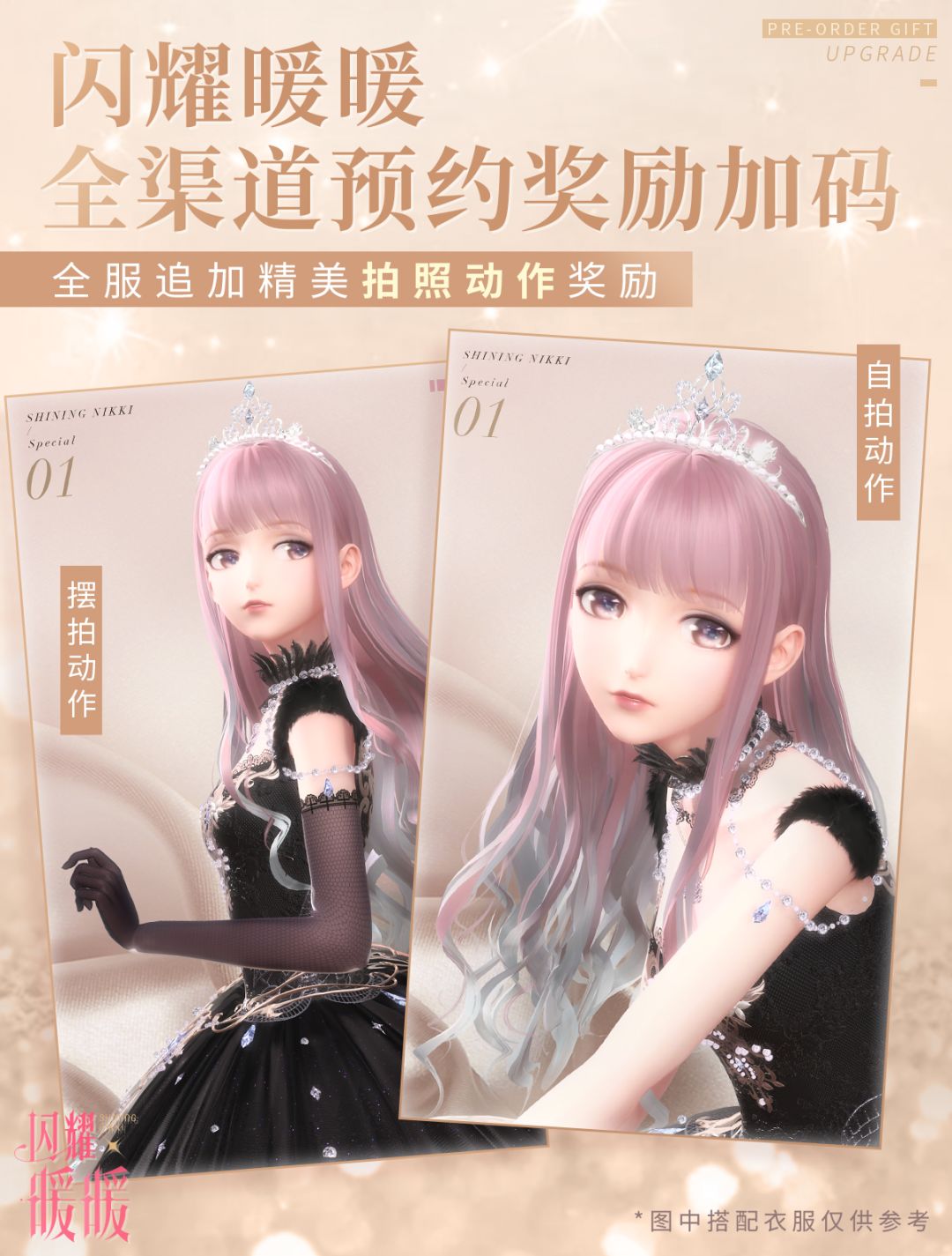 同时,在原有的【公测预约奖励】基础上,我们决定全服追加两款【精美拍照动作】奖励,感谢搭配师们始终不离不弃的陪伴。