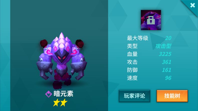 暗元素为邪恶阵营,初始为2星。1技能减防。2A技能有一定概率眩晕目标,2B技能为补刀技能。3A技能为元素特色技能,特别之处是给予对手全体减防,并且己方元素越多,减防比例越高;3B技能也是牺牲技能,死亡时会造成攻击者中毒和无法回血。有传说暗元素是火元素被邪恶力量浸染所变。