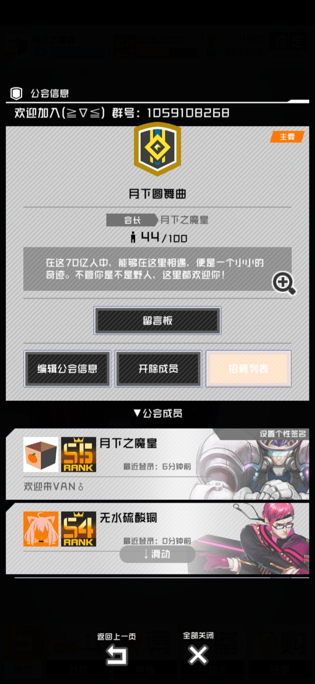 还有空槽位的小伙伴康康这里! 月下圆舞曲公会持续招人中! 为了对抗高达,一个用背刺锤上分的异端站了出来,决定成立公会。