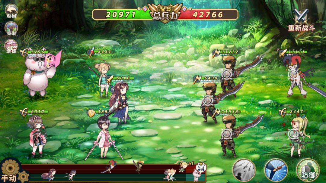 接下来前排直接防御加防到死,后排集火打其中一只斧兵,马代有流血技能直接挂对面魔剑,然后集火打魔剑(因为即使魔剑用吸血,我方前排基本都残了,吸不了多少血)