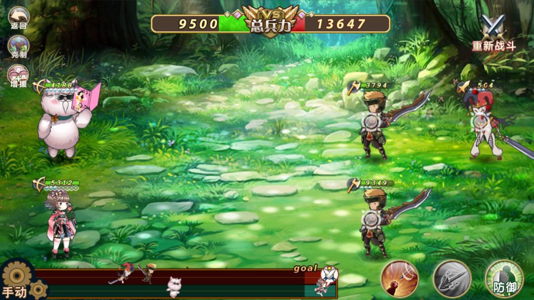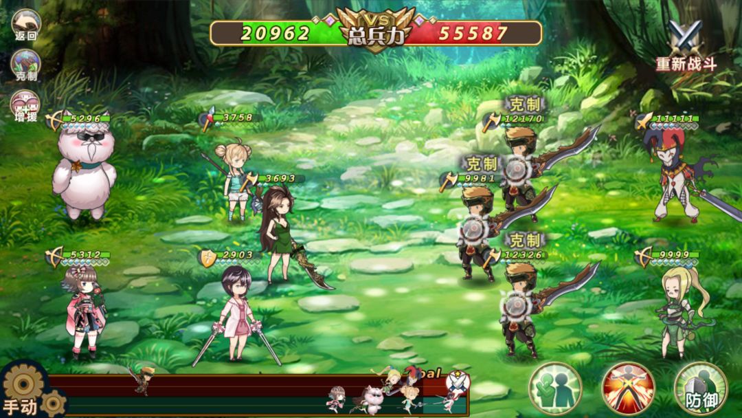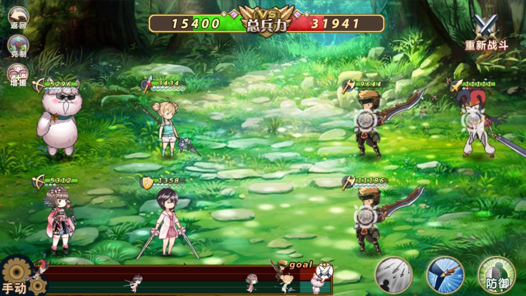 第一回合:开局先被仨斧兵破防以后,就不用担心会被破防了,(因为破防是不会被累计的,只取最高的)刘备保张飞,张飞加反击,对面弓箭必须飞刘备或者飞张飞(因为刘备保张飞)(要是没有就重新战斗刷出来吧),关羽一技能劈血最多的(因为防御低),双马射死对面法师