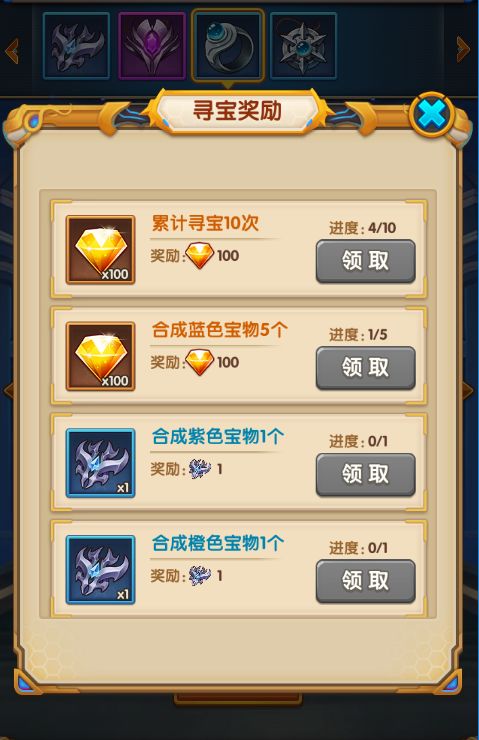 3、紫色及以上品质宝物:需要获得一个对应的碎片后才会出现在寻宝列表中,玩家可通过竞技场、寻宝以及购买商城中的宝物碎片宝箱获得。