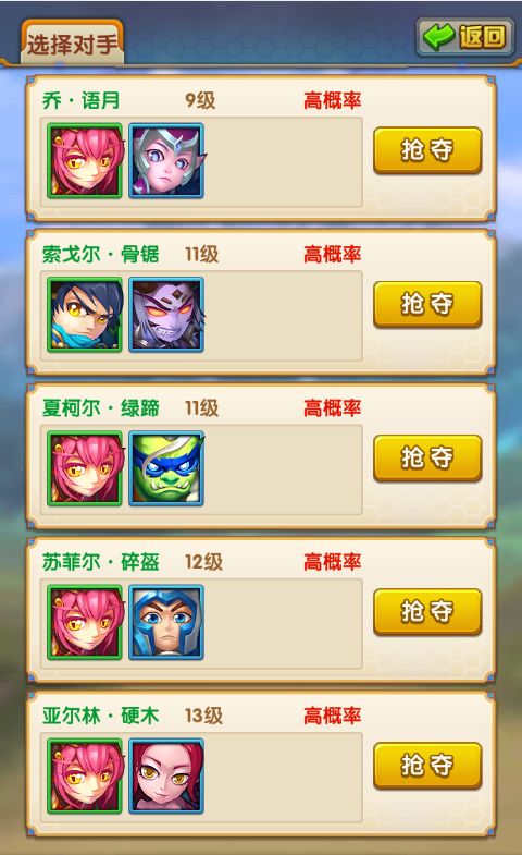 2、寻宝时可以在被夺玩家列表中查看抢夺各个玩家的成功率,该概率分为较高、高、一般、较低、低,但是宝物碎片品质越高,成功率则越低。小编推荐大家选择概率高,这样可以尽快的收集到宝物碎片。