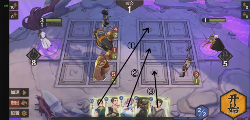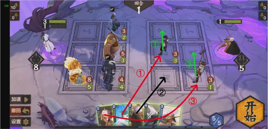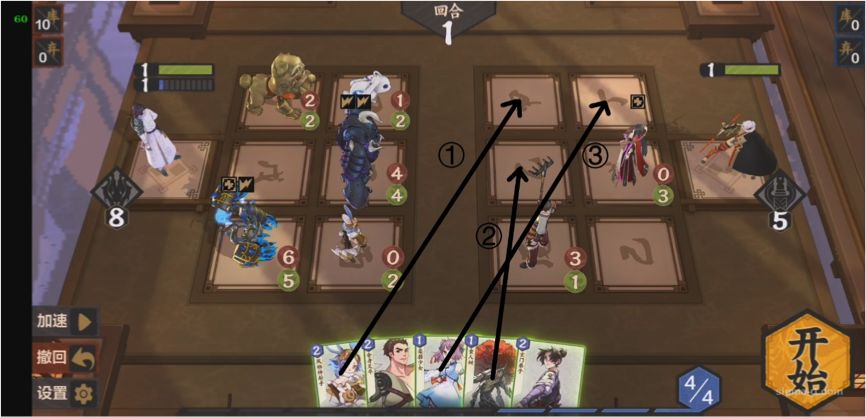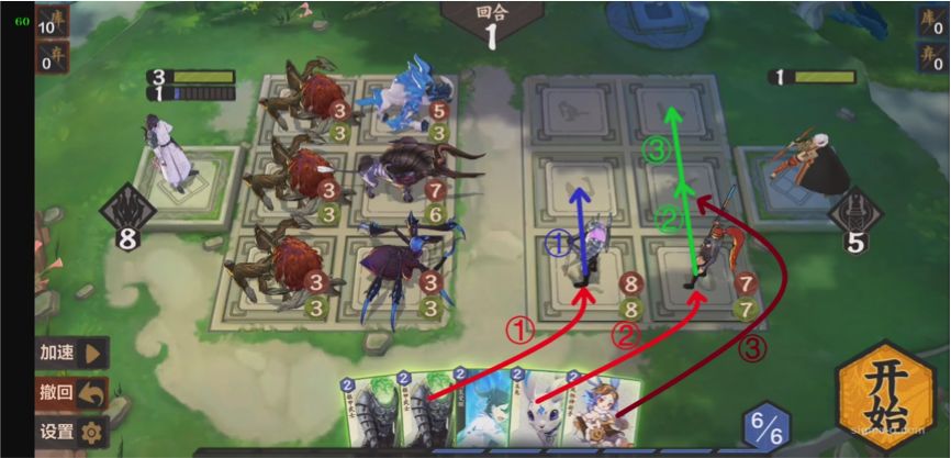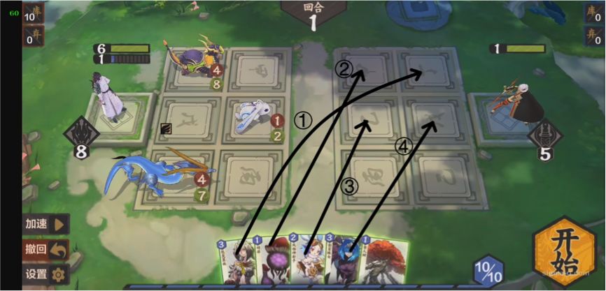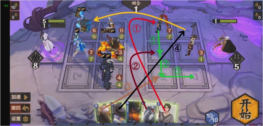 通过观察可以发现,这一个残卷我们是不可能打到对手脸上的,不过由于对手场上有三个食人树让对面慢性死亡,所以这一句负责让自己的英雄和对手的食人树苟住就赢了,对手的狻猊能让正面生物变成(X1Z),己方战神(488)存活时间短,所以要用后排的武者移到上路,为了利用战神,需要让他去中路防守。为抵御蜘蛛,需要武士正面碰,后排需要俩杀不死食人树的将武者顶上去,位置任意,解法(其一)如下: