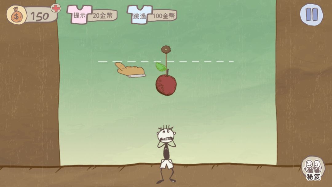 第六关 点击画面中间圆的按钮,点过后挂着苹果的线会逐渐变长,等下方的小人张开嘴把苹果丢进去