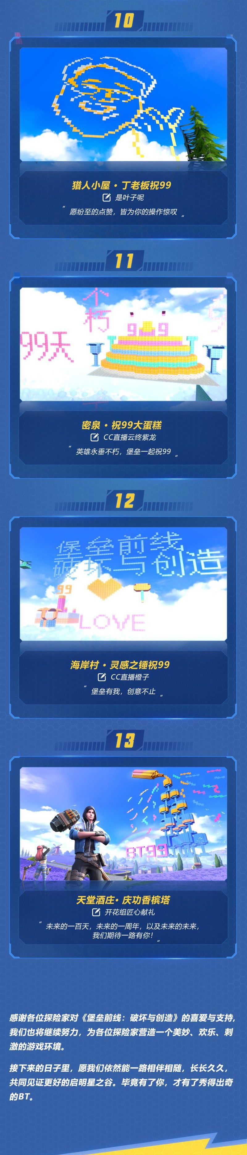 为了感谢玩家对《堡垒前线》的支持与厚爱,《堡垒前线》游戏开发组在“挑战三天不可能任务”中,选择了13件优秀作品,放置在了启明星之谷中,让探险家可以随时感受这些作品制造者对游戏的满满的爱!除此之外,游戏开发组还在游戏中亲手打造了一个巨型香槟塔,回赠给诸位探险家。与此同时,官方还特别剪辑了专题视频,为玩家在短短15秒时间里,展现游戏开发组和探险家的优秀作品。相信这些充满爱意的作品,一定能唤醒探险家对《堡垒前线》的美好回忆!