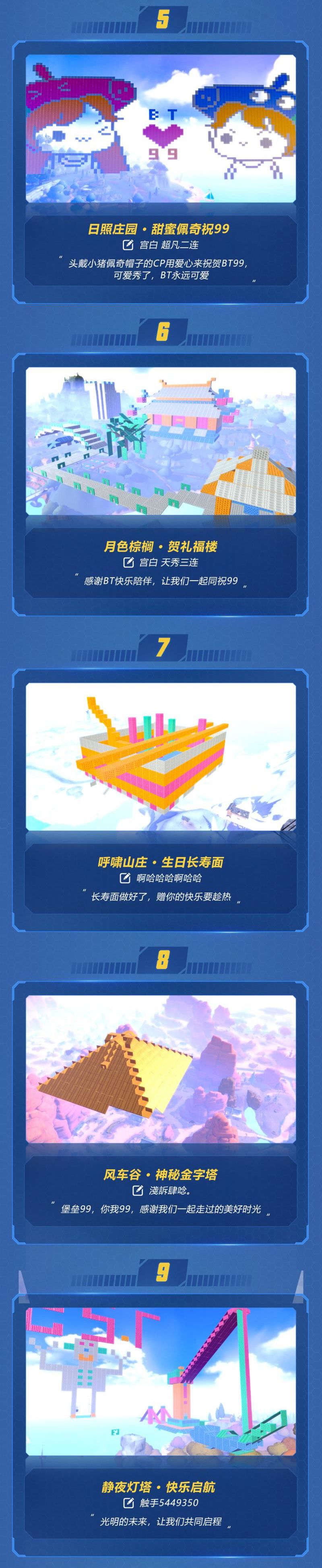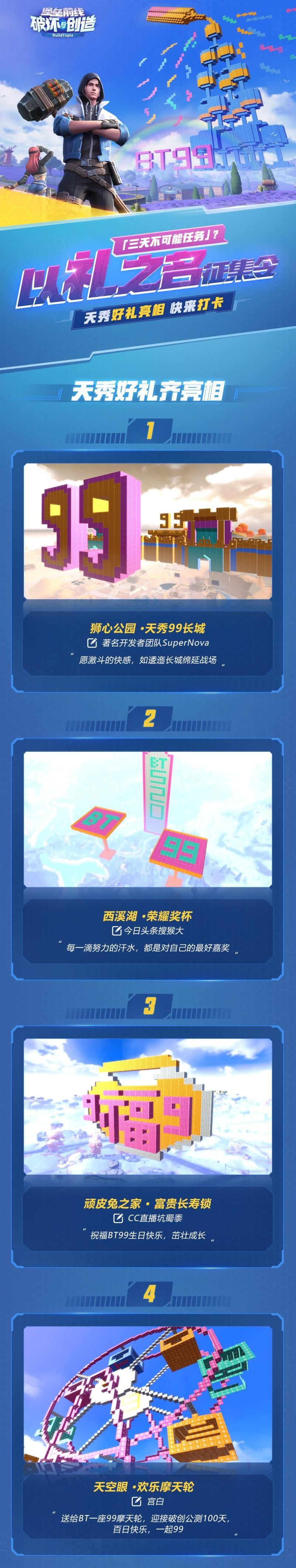 作为《堡垒前线》上线99天狂欢周重要活动, “挑战三天不可能任务”活动已经于8月14日在启明星之谷上线。在短短三天的时间里,探险家在初心岛上,发挥创意,创作与“《堡垒前线》上线99天”主题相关的作品。在活动结束时,《堡垒前线》收获了全区近万份祝99礼物,其中有300多份使用了超过10000块板材。这些探险家用作品将满满的热爱献给《堡垒前线》,为《堡垒前线》庆祝上线99天纪念日,为这款游戏的未来送上祝福。