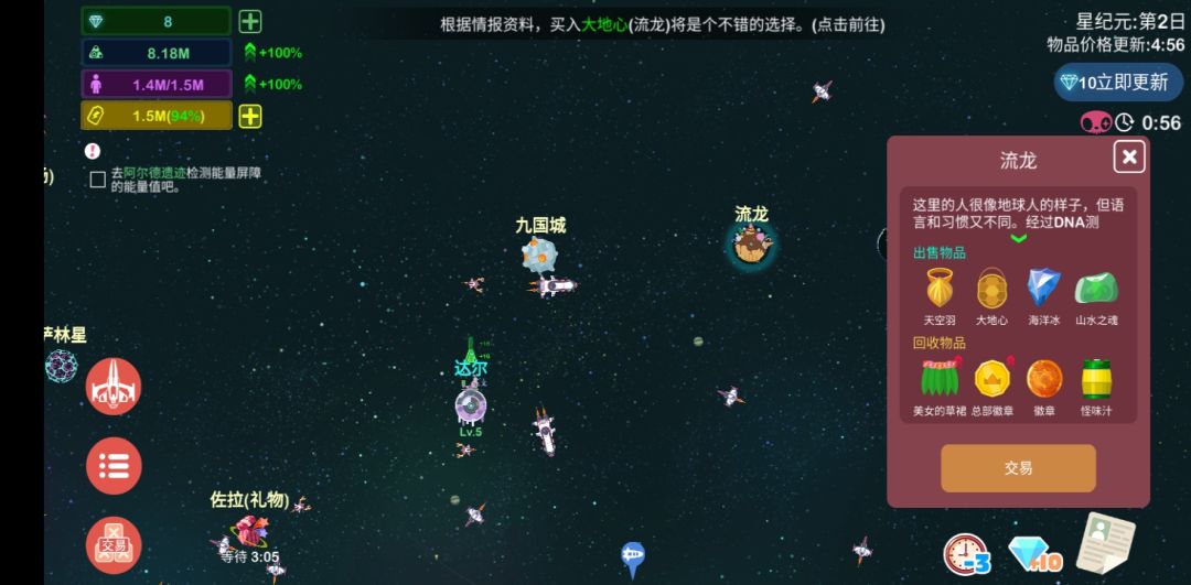 首先这游戏就是个中间商赚差价模拟器,如字面意思,前期主要就是靠在各个星球间买卖赚差价的钱。我自认为已经把这方面吃透了:首先开始一回合(我把每五分钟记一回合),看最远的星球有什么是需求的且涨价的商品(记作目标商品),然后到目标商品所在的星球,查看是不是'推荐'!!!是的话,就大量购入(注意这里是大量购入不是全部购入!!!在后面讲解释),然后在左下角的交易中把目标商品拖拽进运输机并点运输机的'+'号,点至最大,最后再点出售。