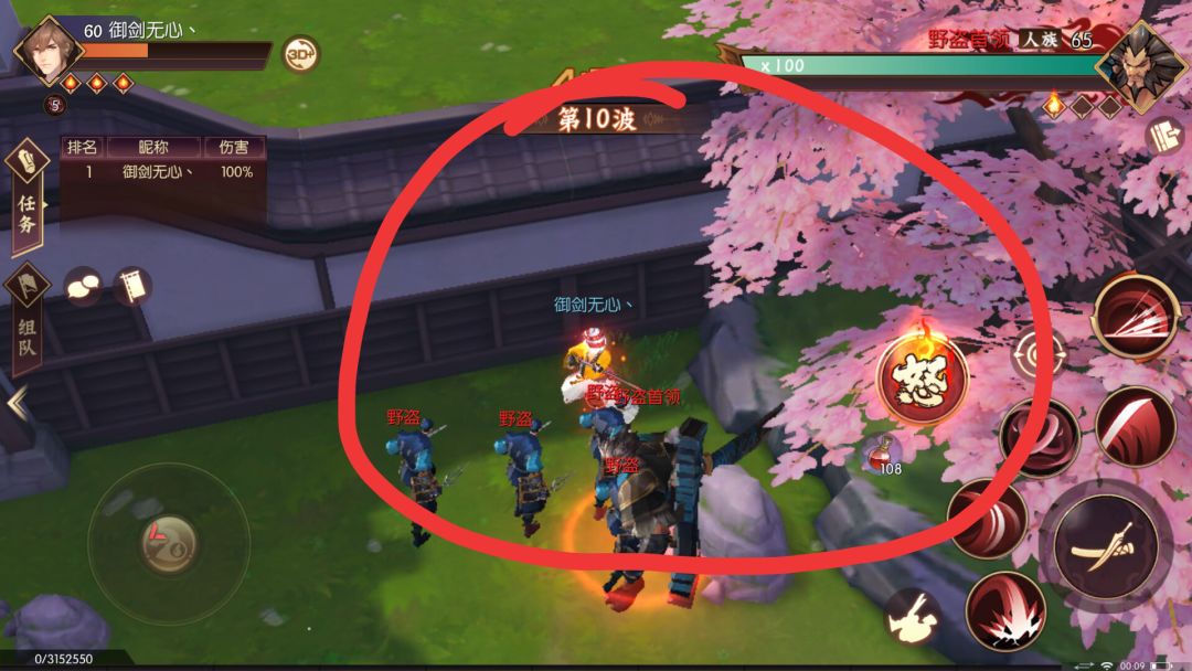 鹤女房进门会就近选择一位玩家发动冲撞。伤害一般。战斗中boss会霸体并释放技能。如上图: 此技能红圈直接秒杀。空白地带为真空地带。不受伤害。如果没有把握躲掉,直接放大躲伤害。有几率会接上一个原地旋转的技能,直接秒杀。别离太近最好。危险系数仅次于红叶狩。此boss每人最少要留一个觉醒,不为打输出。只为了保命抗伤害。