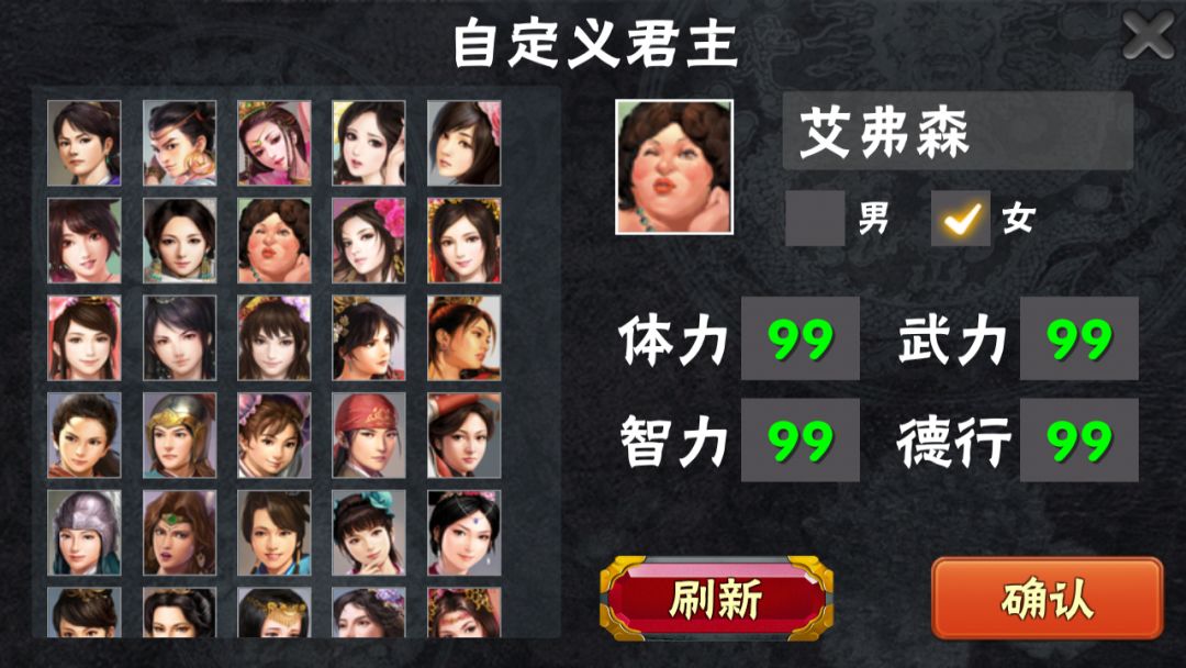 二、4个1。玩家自定义魔将君主,传说中的真蘑菇。本作主线剧情,前期发育是考验玩家的技术,变身之后各种福利,比如刷满属性鬼将,比如内政全满,目前后续剧情没有开发,以至于部分玩家在蘑菇变身后对游戏失去性趣和基情。