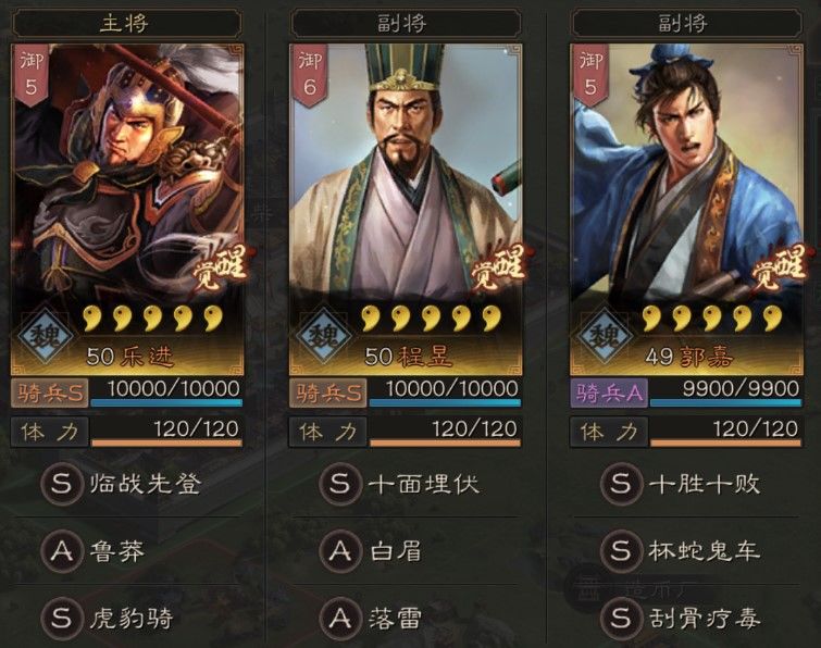 A级全有,S级:虎豹骑、杯蛇鬼车、刮骨疗毒、藤甲兵、魅惑、长驱直入、盛气凌敌、义心昭烈、破阵摧坚、合军聚众