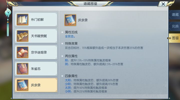 庆余录对玩家的增益分为两种,一种是对玩家基础属性中全攻击的提升。还有一种就是道藏自带的特殊效果的触发。庆余录的道藏特殊效果是攻击目标时,有15%的概率额外造成一次相当于本次伤害25%的伤害。