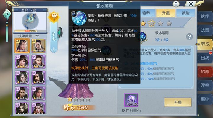 伙伴绝技。抛出银冰落雨针攻击敌人,在造成伤害的同时还能够降低敌人的200点怒气。