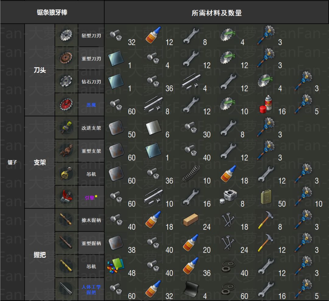 本次带来的内容是锯条狼牙棒所有模组的配件拼装图,无任何营养,纯整合,萌新向。旨在以更简洁直观的图片来给大家展示出拼装所需材料。