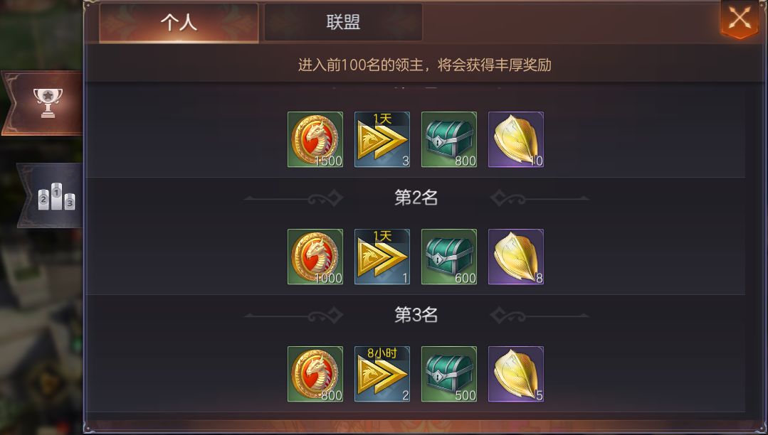 联盟排名奖励与个人排名奖励相同,只是奖励物品不一样。