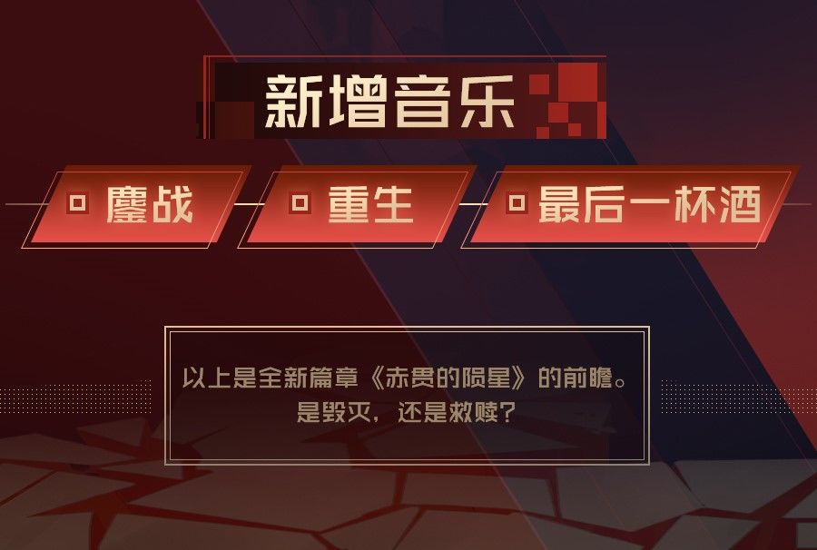 同时,随着新篇章的更新,将新增音乐三首《鏖战》、《重生》、《最后一杯酒》。