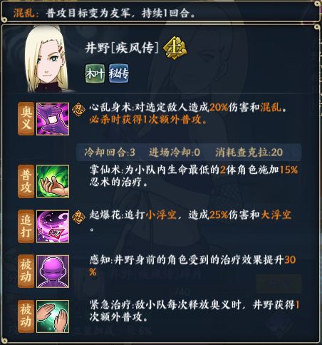 井野疾风传的奥义“心乱身术”进场冷却为0,查克拉消耗也仅为20,首回合即可释放奥义,且具备混乱效果,在控制敌人的同时,还能提高小队的输出伤害,实战效果可观。