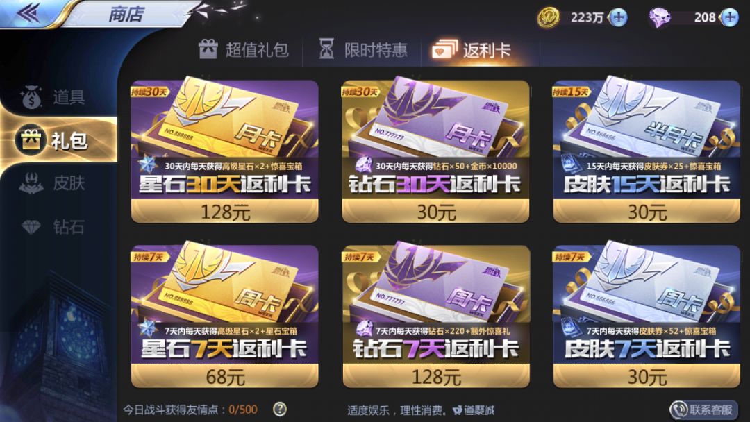 3、购买钻石返利卡:分为月卡-30天(专属头像框(永久)+每天50钻石10000金币)和周卡-7天(每天220钻石+钻石礼盒和其他额外奖励),所有奖励每日五点通过邮件发送。
