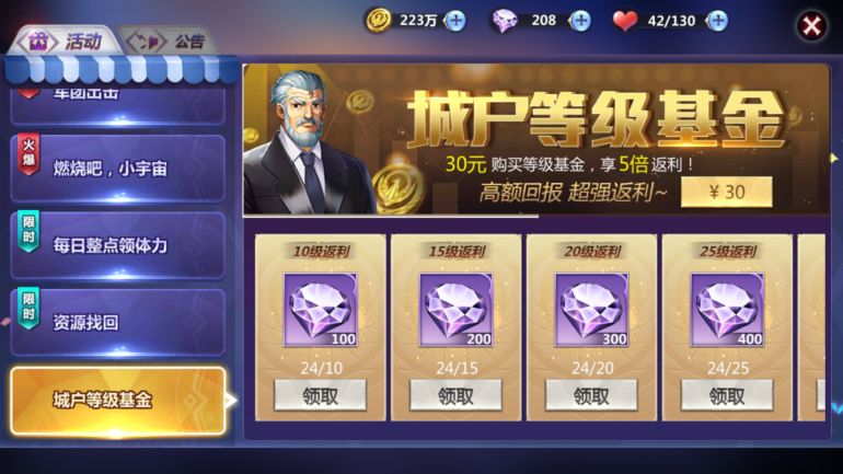 2、购买城户等级基金;花费30元购买等级基金可以获得5倍返利,在10级,15级,20级,25级,30级时分别可以领取100钻石,200钻石,300钻石,400钻石和500钻石。等级基金每个角色只可购买一次,无论何时都可以购买,奖励领取时间无限制。购买入口在大厅-活动-城户等级基金。