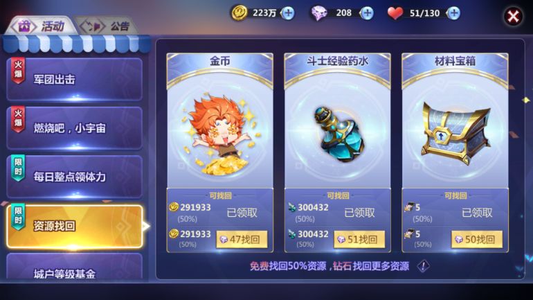 4、奖励找回;当天未获得的经验金币和斗士药水可以在第二天花费钻石找回。