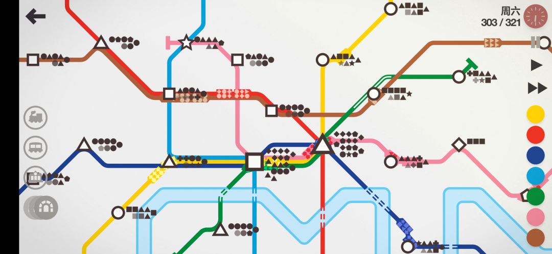 还是放在这里说一下,这一稿中粉线是专线,因为线本身很短,运载能力又是最强的(指往这条线里砸了5个车厢),所以在中间部分穿插了三种普通站一样各一个,是出于分担整体客运压力考虑,所以改线这种东西最后还是要根据实际,毕竟理论服务于实际嘛